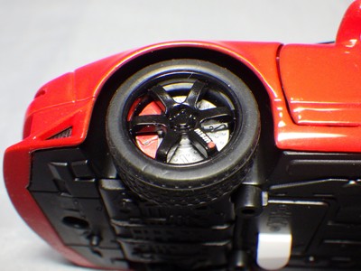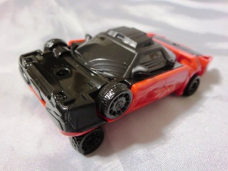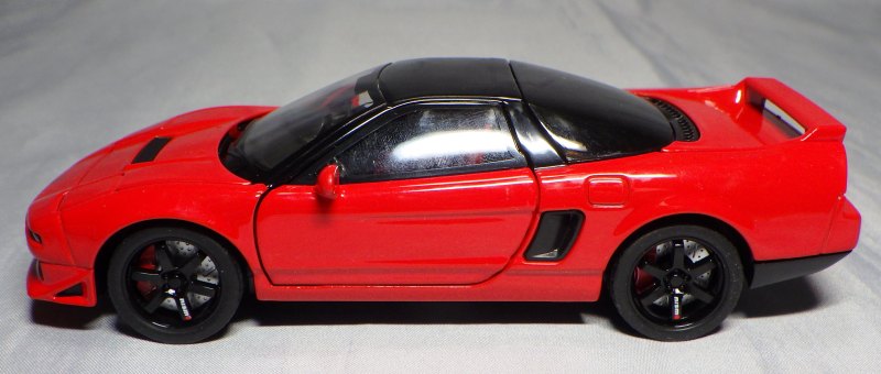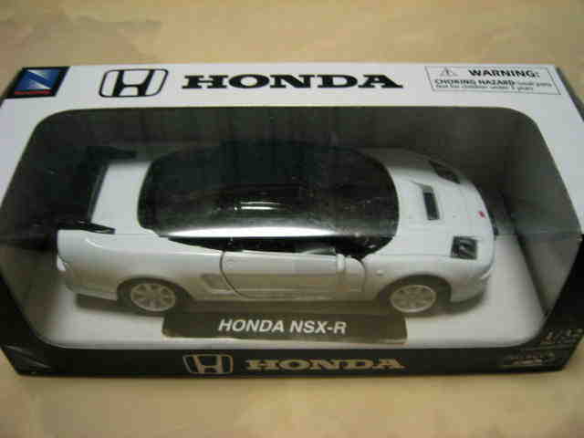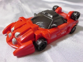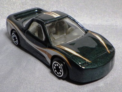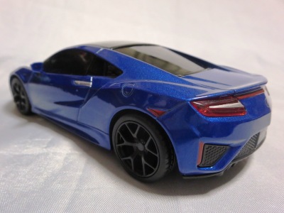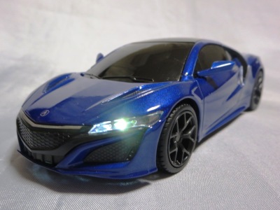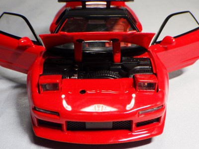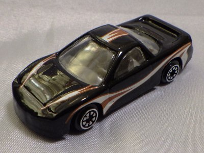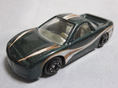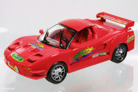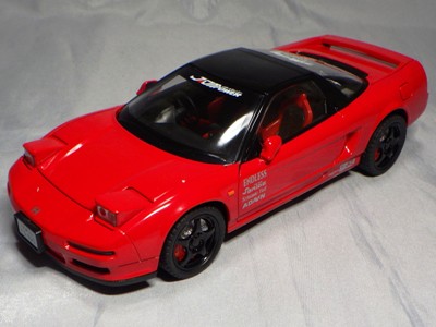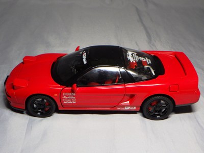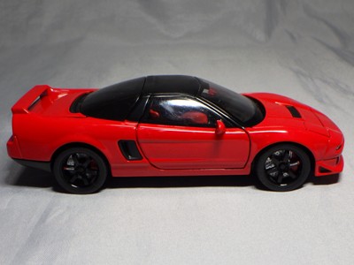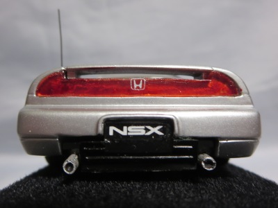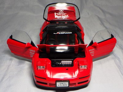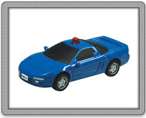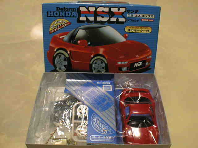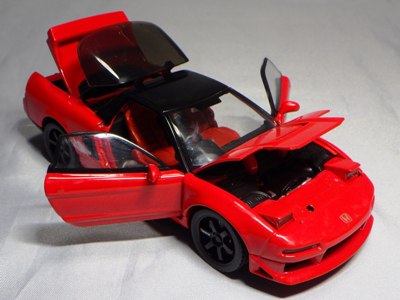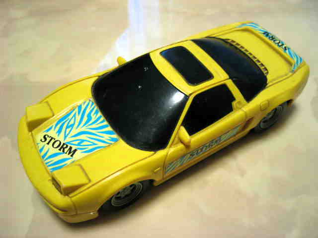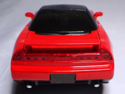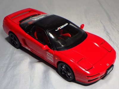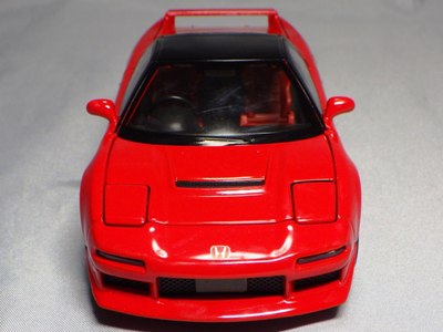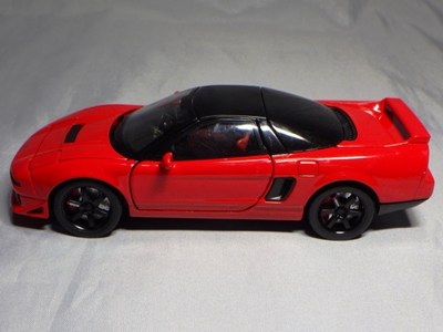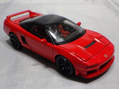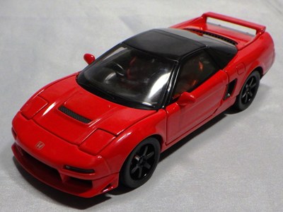 | オークションにて購入。組立式で単3電池2個(別売)とモーターで走行可。スケールは1/40。 | 2002年9月上旬発売。トランスフォーマーシリーズのロードポリス。どこにもNSXという記載はないが明らかに形はNSX。車形態時の全長約55mm。 | ||