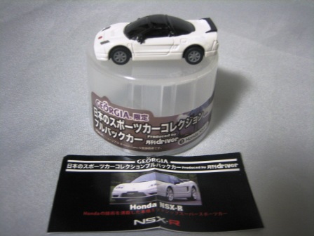 | 2010年10月5日発売。缶コーヒーに付属したミニカー。日産GT-R・日産フェアレディZ・ホンダNSX-R・トヨタ2000GT・マツダRX-7・スバルインプレッサWRX STIの 全6種で、NSX-Rは後期型の白。 | |||