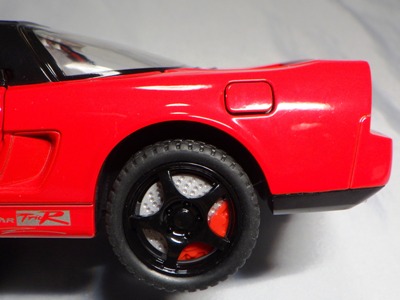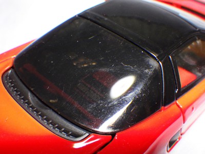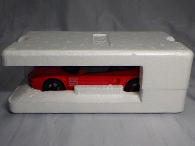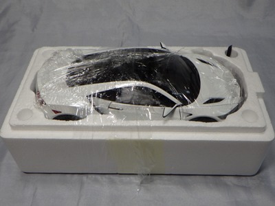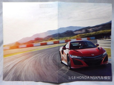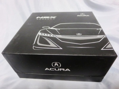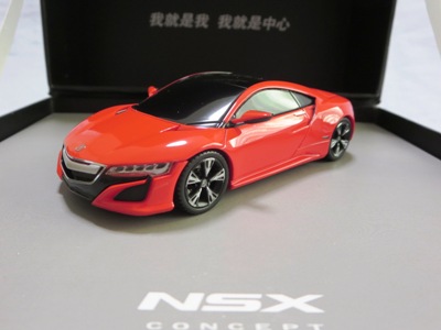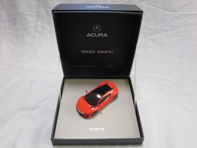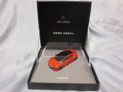 2015年6月5日にヤフオクに初登場した中国のアキュラ純正ミニカーを、相場が下がってきた2016年7月に入手。初登場時の落札価格は17,000円。 NSXコンセプトは2012年1月にデトロイトで開催された北米国際オートショーで最初にお披露目されたシルバーの車をTSMが2012年9月にモデル化したが、今回の商品は、2012年2月に青山でホンダ仕様が公開された後、4月の北京モーターショーにバスクレッドパールUに塗り替えられてアキュラ仕様として展示された時の車をモデル化したもの。ちなみに10月のサンパウロ国際モーターショーでは再びシルバーに戻された。ウインドウは全てブラックアウトされ、内装は見えず、いかにもコンセプトカー然としたものになっている。 当初はTSMのOEM品だろうと考えていたが(実際よく似ている)、よく見てみると、フロントバンパーのヘッドライト横の厚みやホイールのスポーク、マフラーの形状などが微妙に異なり、別物であることが辛うじて分かる(下部の画像参照。上が本商品で下がTSMの商品)。高級感溢れる紙製のボックスに収められており、蓋を開けるとクリアカバーがかけられていてボディはベースに固定されている。カバーは乗せてあるだけで簡単に外せる。 |
