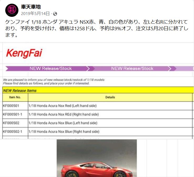 KENG Fai(ケンファイ) KENG Fai(ケンファイ)は中国の新興メーカーで、最近では珍しいダイキャスト製フル開閉モデルを手掛けています。 1990年代半ば頃から世界中のミニカーメーカーの商品を製造していた中国が、そのノウハウを吸収し、設立したメーカーの一つです。 その緻密な造りこみや塗装などのクオリティを高く評価したイグニッションモデルが、2018年から正式に輸入・販売を開始し、その第1弾が世界一高価なスーパーカーと当時話題になった(約3億4,000万円)レバノンのベイルート発のWモーターズが発表した「ライカン ハイパースポーツ」でした。 ワイルド・スピードシリーズ第7作「ワイルド・スピード SKY MISSION」にも登場していますが、あれはポルシェ・ボクスターをベースにしたレプリカとのこと。 その後、KENG Faiの商品は多くのショップで取り扱われるようになり、NSXは2019年1月10日に海外からヤフオクにブルーモデルが初出品されていますが、国内での正規販売はかなり遅く、2021年5月下旬発売予定で、2021年3月に受注が開始されました(実際の発売は6月以降だったかもしれませんが、2021年中には間違いなく発売されていました)。 定価は29,150円(税込)/26,500円(税別)。 KF000501がレッド、KF000502がブルー、KF000503がホワイトで、それぞれにホンダ版(RHD)とアキュラ版(LHD)が設定されていたので計6種のラインナップでした。 唯一入手できたホワイトモデルのKF000503-1がホンダ版なら、アキュラ版はKF000503-2かと思いきや、アキュラ版の品番は枝番のつかないKF000503でした。 国内発売当時、当時世話になっていたショップでは取り扱っていない様子だったので、様子見しているうちに国内市場から定価販売の商品は消えてしまいプレ値商品しか見かけなくなってしまいました。 2024年9月に、ずっとそれまでウォッチリストに入れていた海外からの出品商品(送料込みで国内販売の定価と同じくらいの価格だった)ホンダ版のホワイトモデルを落札して入手しました。 とりあえず、とんでもないプレミア価格が付く前に1種だけでも入手できて良かったと思います。 撮影のため、ラップにぐるぐる巻きにされた発泡スチロールのケースは何とか開けたのですが、その中のミニカーには、さらにこれでもかというくらいラップが巻かれてあったので取り出すのは諦めました。 |