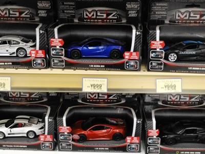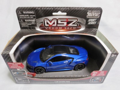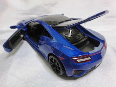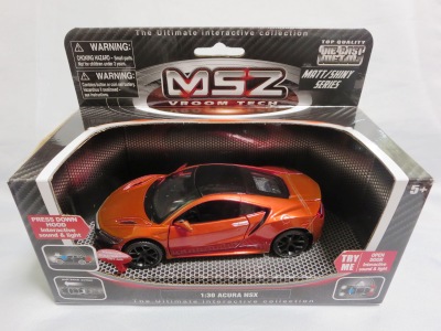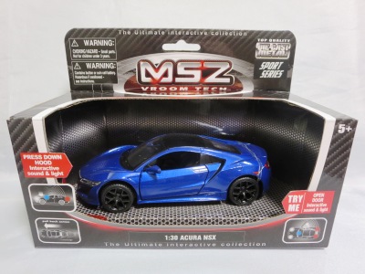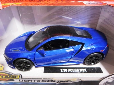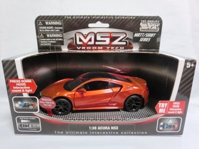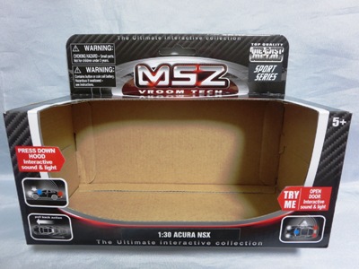 ミニカーの全長は約14cmで、新型の実車の全長が4m90cm(ちなみに初代は4m43cm)なのでスケールはちょうど1/32。1/36のRMZ Cityと並べてみると一回り大きいのが一目瞭然。 サイドウインドウをタッチするとヘッドライトが点灯してエンジンがかかるサウンドが鳴り響き、フロントウインドウをタッチするとヘッドライトが点灯して派手なエンジンのサウンドが鳴り響きリアタイヤが回転して前進。 リアウインドウをタッチするとヘッドライトが点灯し、これまた派手なスキール音を鳴り響かせながらリアタイヤが回転して後退するというギミックを内蔵。 出品者の方は主にヨーロッパからミニカーを輸入されている方で、この商品は初めてアメリカから輸入した商品とのこと。 この方と取引のあるバイヤーの方によれば、ヨーロッパでの販売予定もあるとのことだが、パッケージの裏面には輸入元として「コストコホールセールジャパン」の記載があり、日本でもそのうち発売されるのかもしれない。NSXは確認されていないが単品はトイザらスで販売されている。中国製。 パッケージの全長は58.5cm、高さと奥行きは10.5cm。 |