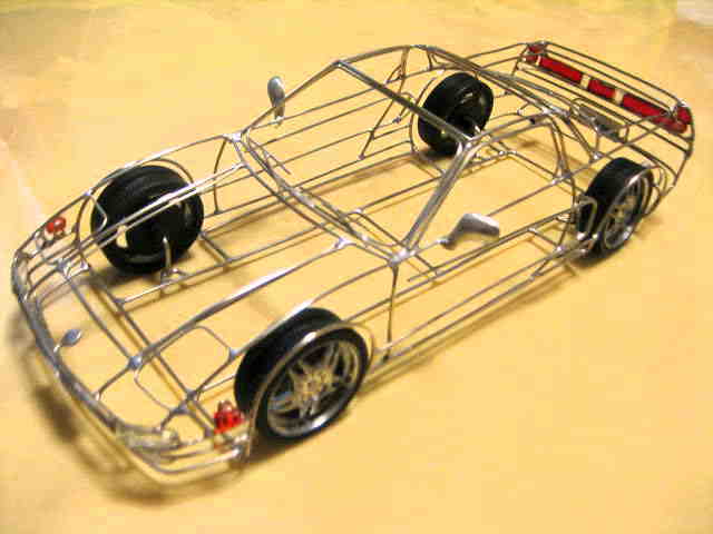 ハンドメイドワイヤーフレーム1/20(M・Y氏) 2007年9月にハンドメイドでワイヤーフレームの車を制作される方がおられることを知り、さっそくメールでNSXの制作を依頼。銅(ブロンズ)と洋銀(ニッケルシルバー)の2種を制作していただきました。 2か月後に納品された作品は素晴らしい出来映え。スケールは1/20と、なかなかのサイズなので見応えがあります。 ちなみに、M・Y氏の作品は、S2000がツインリンクもてぎのホンダコレクションホールにも展示されています。 |