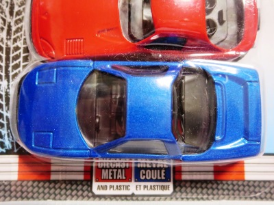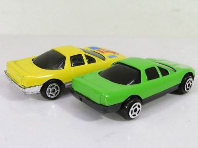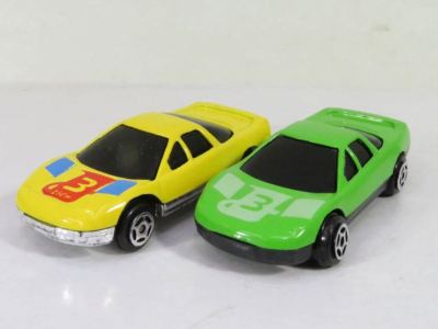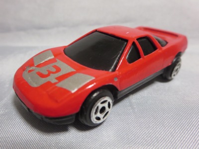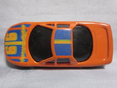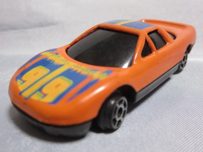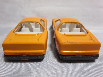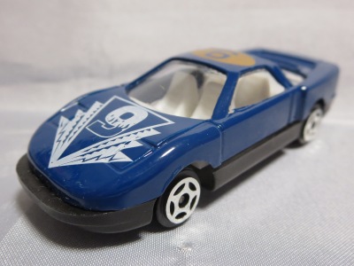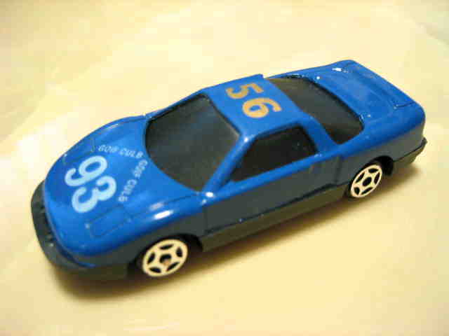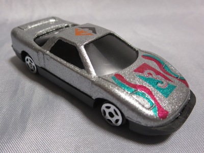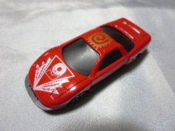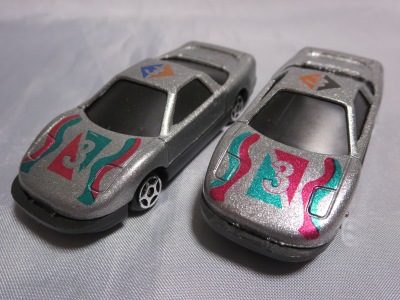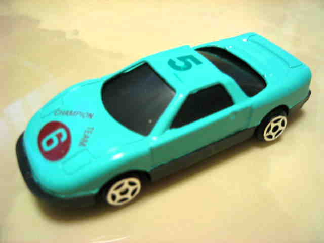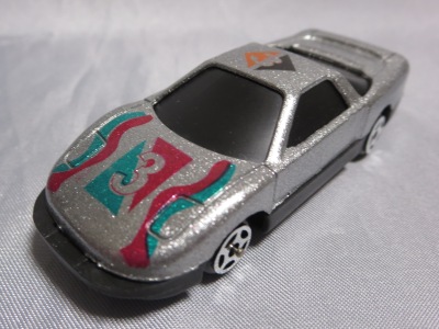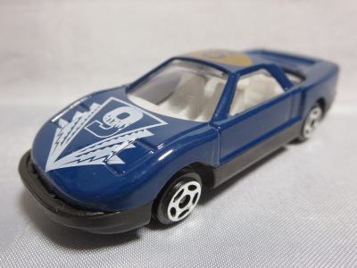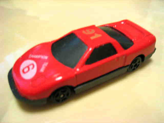 | 2001年9月に100均ショップのダイソーで購入。5台セットの価格で、モールドは超甘い。中国製。全長75mm。 | 2004年9月フランスのコレクターより入手。オレンジの車がNSX。ボンネットに「9」、ルーフに「GTB」のタンポ。中国製。ダイソーで購入したミニカーと同じ型。 | ||