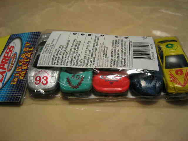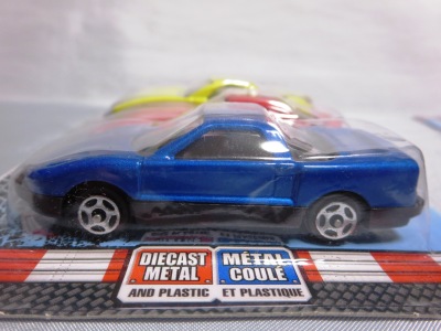 | 2005年1月フランスのコレクターより入手。付属する5台のトミカサイズのチープカーのうち黒い車がNSX。ボンネットにサングラスをかけた太陽、ルーフに「3」のタンポ。中国製。右の2タイプのセット物の画像は共に同じ黒いNSXミニカーを含んだトランスポーターの色違いで未入手品。 |