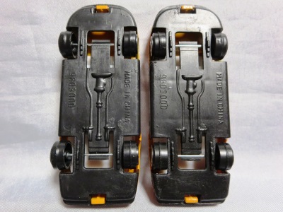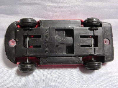 2019年9月にいつもお世話になっている神奈川のコレクター仲間のK氏が譲ってくださったもの。 このページのトップに掲載されている2001年9月に入手したモデルのカラーバリエーションで、ボンネットとルーフ上のタンポ印刷のカラーリングが異なっている。 所有品も画像を撮り直したので比較していただきたい(左が元々の所有品、右が今回頂いたモデル)。 今回頂いたモデルの方がラメの輝きが強い。裏板は全く同じ。 |