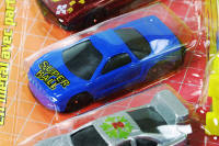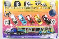 | 2004年9月フランスのコレクターより入手。付属する5台のトミカサイズのチープカーのうち青い車がNSX。ボンネットに「SUPER BALL」のタンポ。中国製。見かけない型。右の画像はトランスポーターの色違いで未入手品。 |
