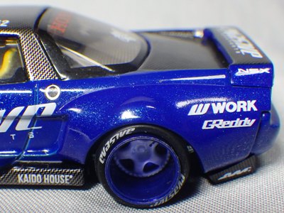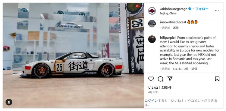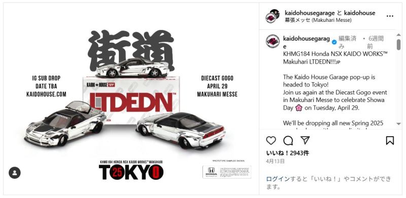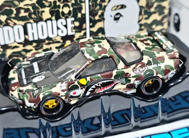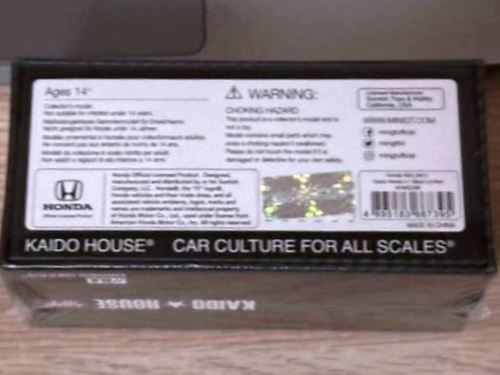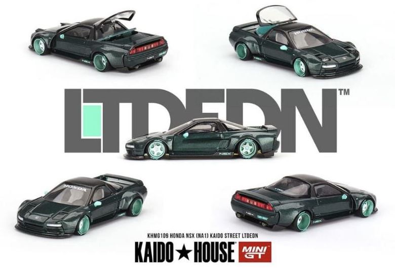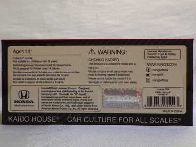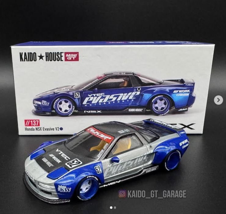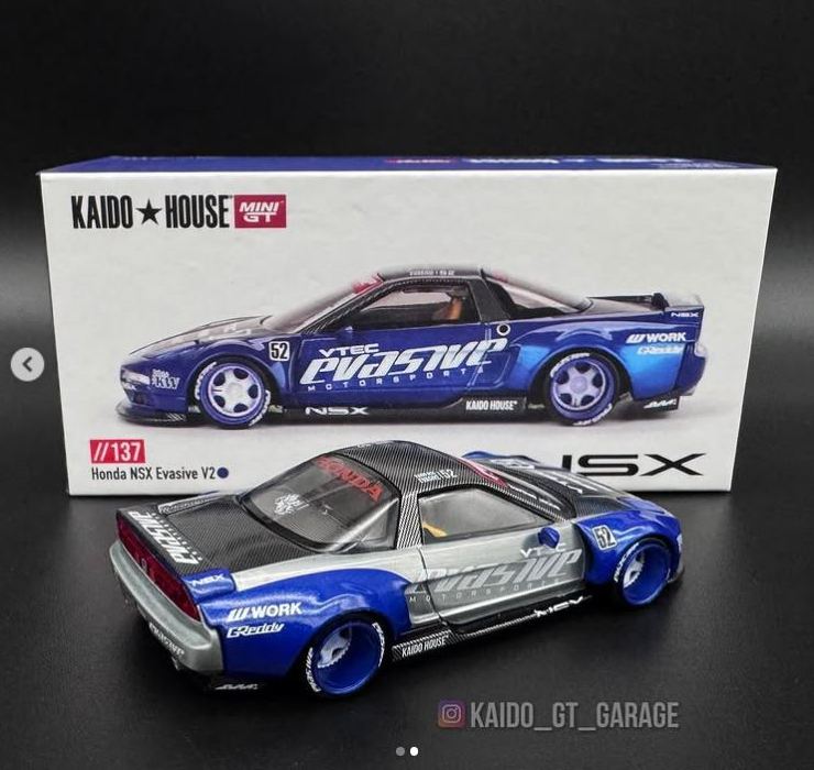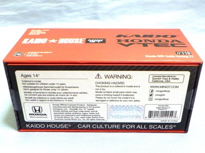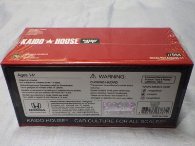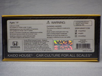 2023年9月22日に受注が開始され、2024年4月26日に発売された(ヤフオク初登場は4月22日)。 当初はシュリンクパックを開封する予定はなかったのだが、この商品には一定の割合で限定のチェイスカーが入っている可能性があるため運試しで開封。残念ながらハズレだった。 高額モデルだけあって質感は非常に高く、トミカプレミアムを超える。 日系アメリカ人カスタムカー・デザイナー、JUN IMAI(ジュン・イマイ)がプロデュースする人気シリーズ「KAIDO HOUSE × MINI GT」の新作の一つで、KAIDO HOUSE初のホンダ車であり、南カルフォルニアのパフォーマンススポーツ及びチューニング会社である「Evasive Motorsports(エヴァーシブ・モータースポーツ)」とのコラボモデル。 2024年2月29日に受注開始をお知らせしたシリーズNSX第2弾の1/64「KHMG119 ホンダNSX Kaido Racing V1(左ハンドル)」も発売が待たれる。 |