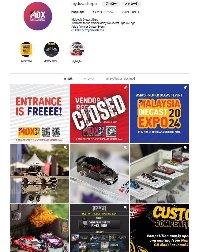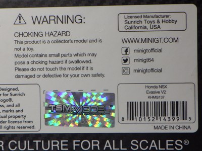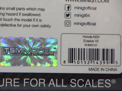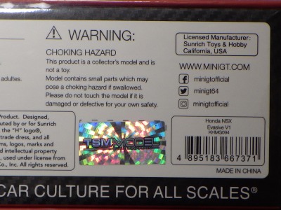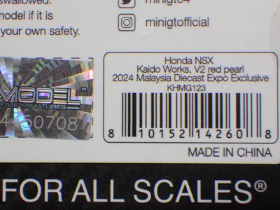 2024年4月26日発売のTSM(MINI-GT)1/64「KHMG094 ホンダ NSX Evasive V1(左ハンドル)」のチェイスカーバージョンをなんとか入手し、5月18日にご紹介したが、また別のバリエーションをヤフオクで発見。 2014年5月18〜19日にマレーシアのトロピカーナガーデンズモールで開催されたマレーシアダイキャストエキスポ(MDX)2024会場限定バージョンである。 会場ではMINI-GTのみならず、トミカやINNO MODELやPOPRACE、イグニッションモデルなどの限定品も販売された模様。 パッケージにイベント名がプリントされているほか、車体のロゴカラーがホワイトからゴールドに変更。 品番や商品名からして異なっている。 東京の出品者がヤフオク等に5台を出品したうちの1台を入手(パッケージに貼られたシールは海外のサイトの画像では見られないので出品者が貼った整理用のものと思われる)。 |