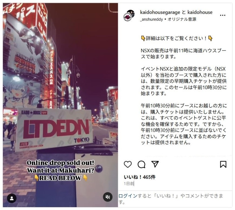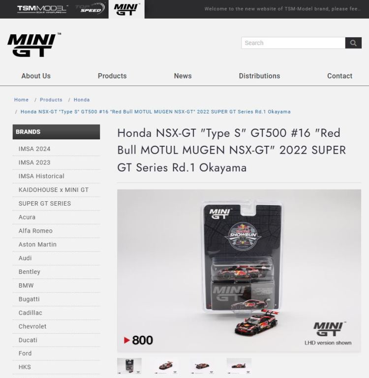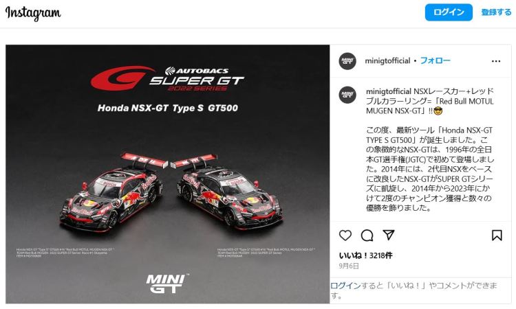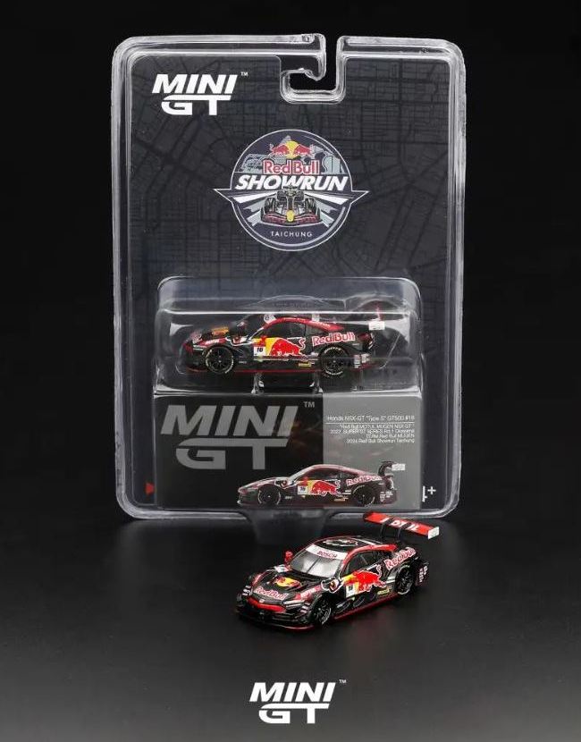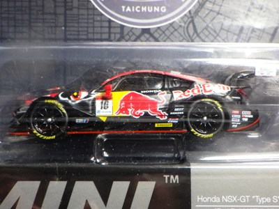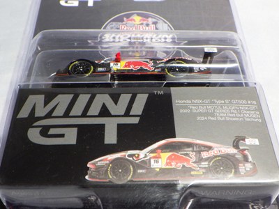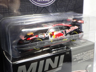 発売から3か月近くたって2024年12月17日にヤフオクに初登場するくらい流通量は少ない(それを落札できた)。 2024年の9月28日に台湾・台中市で開催されたレッドブルのF1デモランイベント「レッドブル Showrun Taichung」で販売されたもので、このイベントはRBフォーミュラワンチームからF1に参戦する角田裕毅選手がレッドブル・レーシングの2012年マシンRB8を走らせたことで話題になったイベントで、NSX-GTが同時に走行したわけではない。 会場のMINI-GTのブースでは、このNSX-GTのほか、2021年のアメリカGPで優勝したマックス・フェルスタッペンのレッドブルRB16B、ランドローバーのディフェンダー110のミニカーが販売された。 各モデルの販売価格は不明だが、会場の入場料は500ニュー台湾ドル(当時のレートで約2,700円・本日のレートで約2,400円)だった。チケット購入には身分証明書が必要だったとのこと。 |