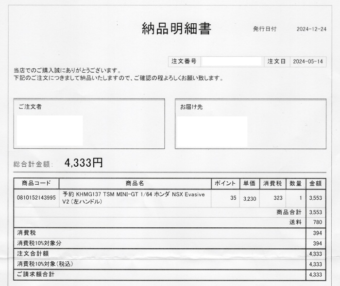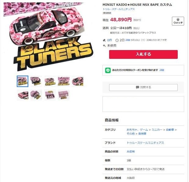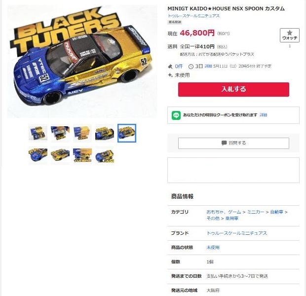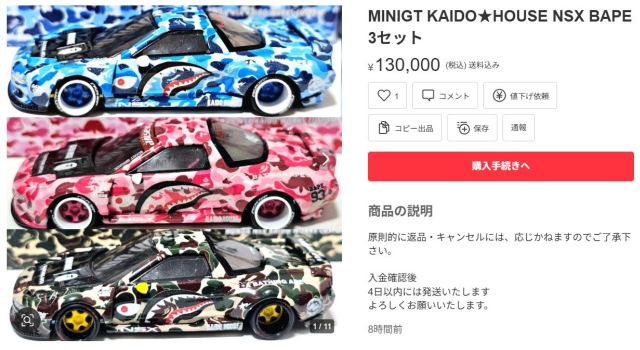 2019年12月2日にヤフオクに初登場した1/64 MINI-GT「MGT00052-L Honda NSX GT3 #86 2017 IMSA Watkins Glen LHD」のMijoパッケージ(おそらく品番は「MGT-00052-MJ」)。 送料は無料となっていたが、即決価格は3,432円と決して安くはなかった。商品説明をよく読むと、「amazonの段ボールにて発送されることがあります」という記載があったので、もしやと思い、amazonをチェックすると、2,420円(送料無料)で販売されているのを発見。 当然ヤフオクの方へは入札せずamazonに注文した。ちなみにこの商品の取扱開始日は11月20日であった。 「MGT00051-L Honda NSX GT3 #30 2018 24 Hours of Spa LHD」のMijoパッケージ(こちらの品番はおそらく「MGT-00051-MJ」)も同じ出品者(以前Linxのプルバックカーを購入したことのあるA-kind)がamazonに出品していたので同時注文した。なぜかこちらは2,999円とやや高く、取扱開始日も1日ずれた11月21日であった。 注文した翌日の12月3日に両方とも届いた。12月3日現在、正規品は国内未発売である。 12月4日になって、A-kindが12月2日から4日にかけてこの2種を数点ずつヤフオクに出品していたことが判明。 送料は別とはいえ、開始価格は1,899円と比較的良心的。なぜか入札はなし。 |