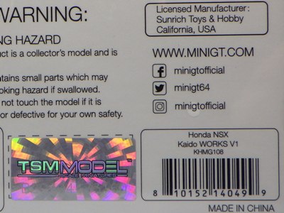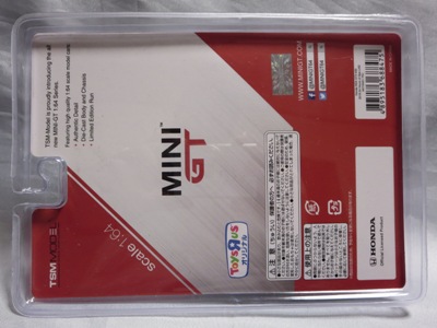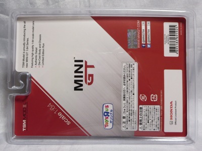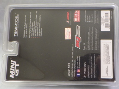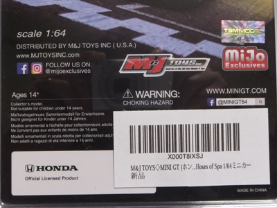 2019年5月6日にヤフオクに初登場した「TSM×MiJo MINI GT NSX GT3 レギュラー & チェイスセット」。 いずれも2019年4月10日発売のMINI-GT1/64「Honda NSX GT3 Presentation」のブリスターパックバージョンであるが、2つのうち1つはシルバーカラーで、これが「チェイス」仕様である。 このセット商品の出品価格は即決16,800円と手が出しづらかったので、同じ出品者の方が大量に単品で出品されていたレギュラーバージョンの方を落札して入手。 「MiJo Exclusives」のロゴが入っているが、これはアメリカの玩具問屋「M&J TOYS」のブランド。公式facebookにはこれまでにリリースした大量のモデルと共に過去の店舗の画像もアップされているので間違いなさそう。 |