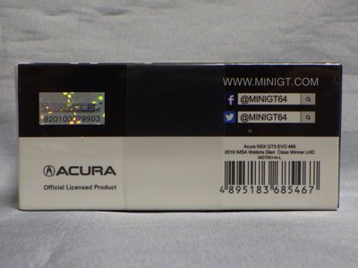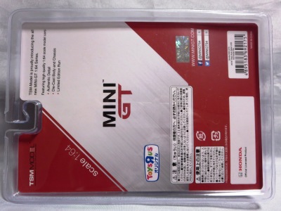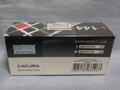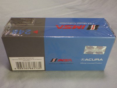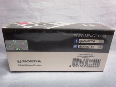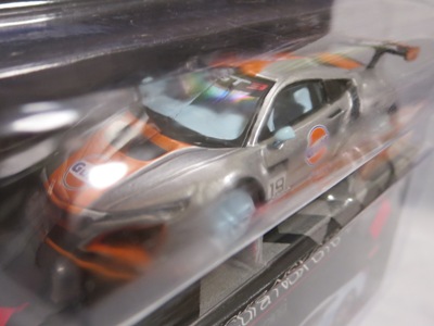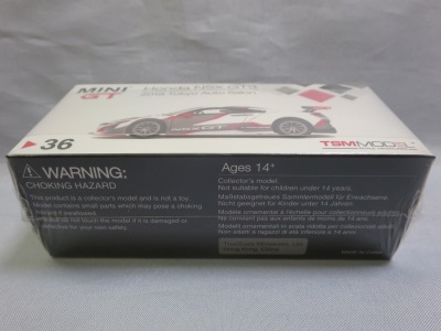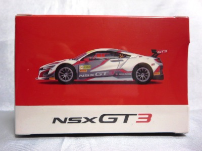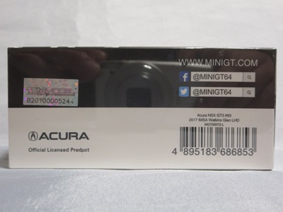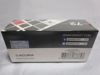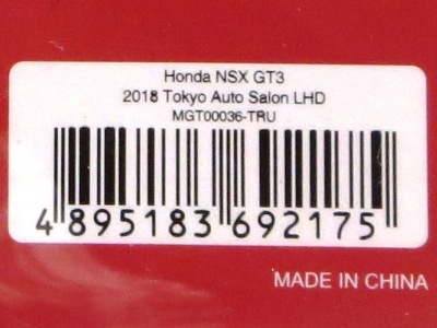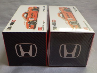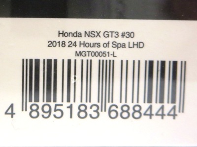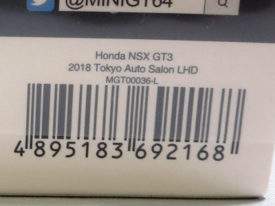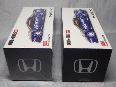 2019年4月15日に受注が開始され、6月発売予定であったが、7月31日に発売された。 受注時の商品名は「ホンダ NSX GT3 東京オートサロン2018」、発売時の商品名は「ホンダ NSX GT3 2018東京オートサロン LHD」であった。 この商品名変更で、アキュラ仕様ではないホンダ仕様なのに左ハンドルとなっていることに初めて気がついた。 確認したら実車も確かに左ハンドルであった。 シュリンクパックを開封するのがためらわれたので、未開封のままボックスの画像のみ撮影。 |