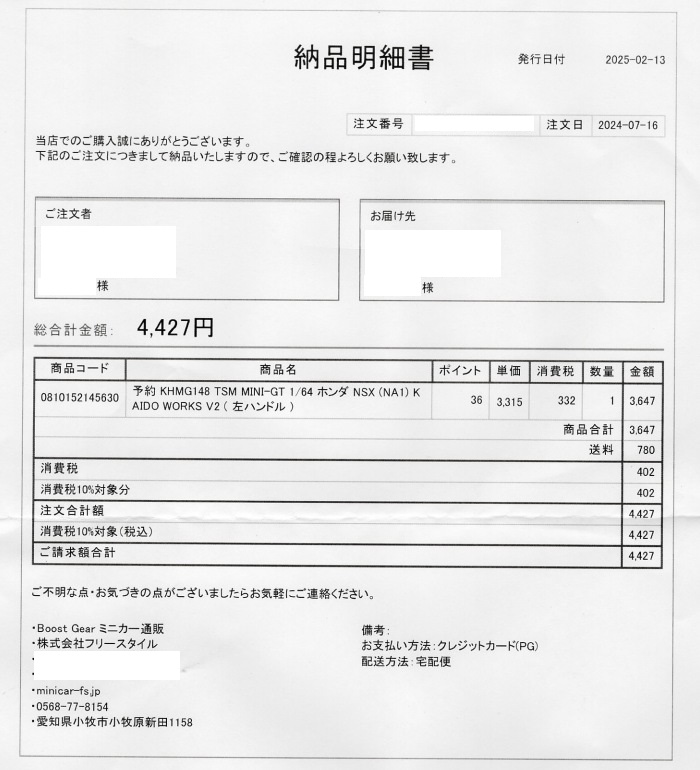 2023年11月24日に受注開始。2024年6月20日に発売(発売の数週間前から並行輸入品らしきものがヤフオクに出品されていた)。 私の購入したブーストギアさんでの価格は値引きされて2,980円税別(3,179円税込)であった。 MINI-GTの例に漏れず特別仕様のチェイスカーも存在するので思い切って開封しましたがハズレだった。 |