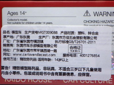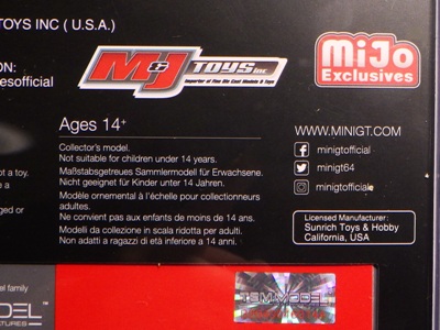 2021年9月18日に発売された「MGT00248-L」の北米限定Mijoブリスターパッケージ版である「MGT00248-MJ」。 amazonで2021年10月22日から取り扱っていたのを、2022年2月に見つけて入手。 過去にも紹介している通り、Mijoはアメリカの玩具問屋の「M&J TOYS」のブランド。 日本で通常販売されているシュリンクパックされた紙箱の商品と違い、こちらのバージョンは、中のミニカーも箱もブリスターパック越しに見ることができるのが魅力。 価格は通常品の税込1,760円に対し1,980円と妥当なものであった(amazonの直販品ではなかったので送料は別)。 |