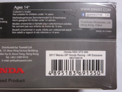 Honda NSX GT3 #84 2017 Macau GP Honda Racing,Hong Kong Exclusive /115香港ドル/トゥルースケールミニチュアズモデル |