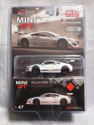 | 1/64 MINI-GT「MGT00047-MJC ACURA NSX GT3 NY AUTO SHOW 2016 LHD 北米限定MiJoブリスターパッケージ チェイスカー」/2,000円税別/トゥルースケールミニチュアズモデル | |