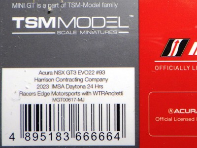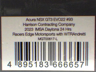 2023年8月2日に受注が開始され、2024年2月22日に発売された。 同時に受注を開始していたMijoブランドバージョンの「MGT00617-MJ アキュラNSX GT3 EVO22 IMSA デイトナ24 2023 #93 WTR Racers Edge Motor sports(左ハンドル)」は遅れて発売予定。 |