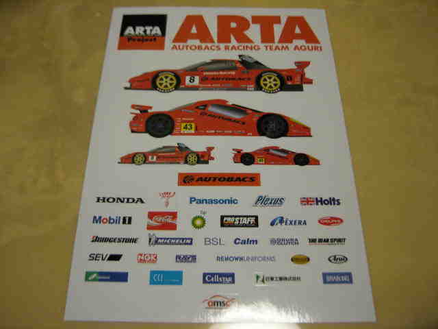 | 2016年12月 ヤフオクにて購入。29.6p×21pのA4サイズ。サーキットで配付されたもの。ARTA(エーアールティーエー:AUTOBACS Racing Team AGURI)は、元F1ドライバーの鈴木亜久里とオートバックスが提携して1997年に設立したモータースポーツプロジェクト。設立当初の名称は「ARTA F1 Project」だったが「F1」の文字を正式な許可なく使用したことが問題になり、2002年より「ARTA Project」に変更。GT500クラスでは2000年にマシンをGT-RからNSXに変更し、オーナーの亜久里と土屋圭市がドライブ。2001年より亜久里に変わって金石勝智がドライブし、この年は最終戦までタイトル争いを演じた。GT300クラスでは2001年にトヨタMR-Sで参戦を開始。2002年には新田守男・高木真一のコンビでシリーズチャンピオンを獲得。2003年にマシンをオートバックスが独自開発したガライヤにスイッチしている。 | |
