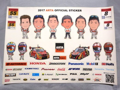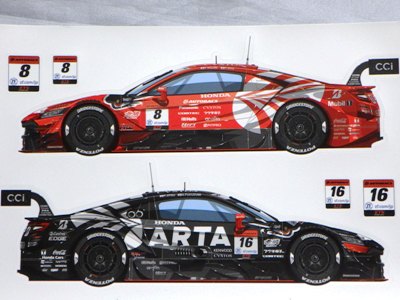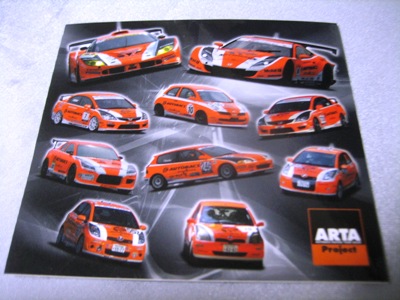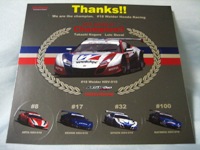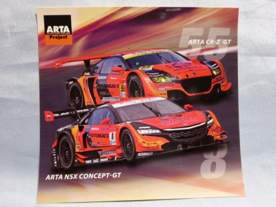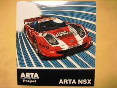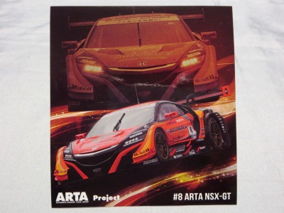 | 2009年スーパーGT最終戦に てホンダファンシートの観客にマフラータオル(これは第1戦でも配布)とメッセージカードとセットで配布。07年のARTA NSXダブルタイトル獲得記念ステッカーと同じ形式で画像は台紙のもの。2ツ折りの台紙のサイズは12.8p×18p。 中に収められる楕円形のステッカーの幅は13.5cm。 | |