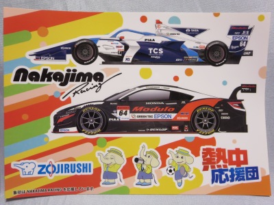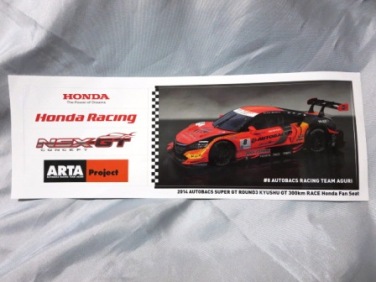 | 2015年1月オークションにて入手。 スーパーGT2014第8戦もてぎGT250kmレースで、ホンダファンシートの特典の1つとして配付されたもの。10.5×29.7cm。 | |