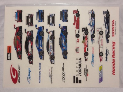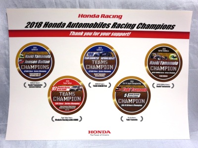 2018年12月9日にMOTEGIで開催されたホンダレーシングサンクスデイ2018などのイベント会場での配布物。 スーパーGTのドライバー部門、チーム部門、スーパーフォーミュラのドライバー部門、スーパー耐久のチーム部門、F4のドライバー部門の計5部門のチャンピオン獲得を記念したステッカーセット。 モーターサイクルバージョン(こちらは9部門でのチャンピオン獲得を記念したもの)も存在する。 サイズはかなり大きめの21.0×29.7cm。 |
