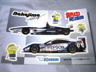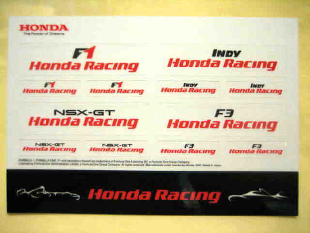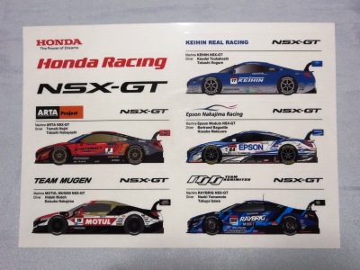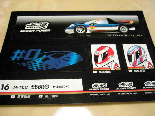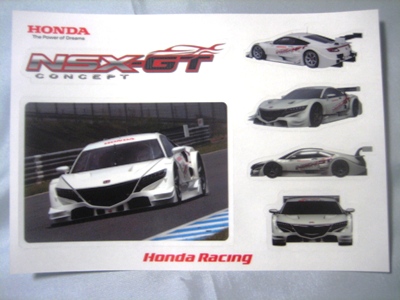 | ヤフオクにて購入。10p×14.7p。F1、INDY、NSX-GT、F3の各ステッカーが、大1枚、小2枚ずつ入っている。サーキットで配付されたもの。 | |