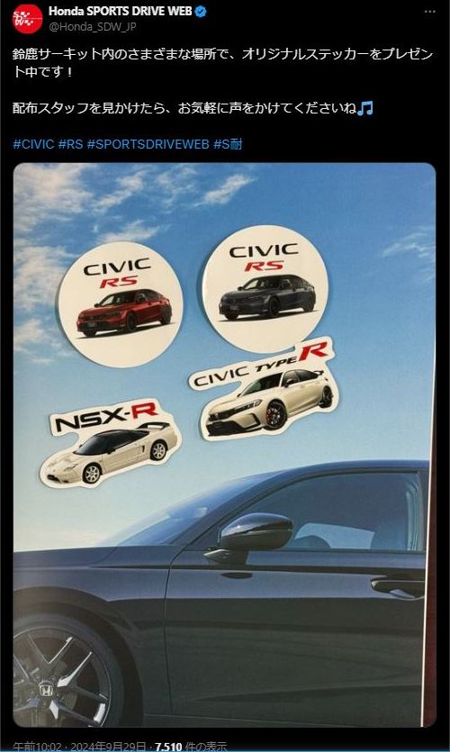 いつもGT関連グッズでお世話になっている大阪のS氏が、2024年9月28日〜29日に開催された「ENEOS スーパー耐久シリーズ Empowered by ブリヂストン第5戦 SUZUKA S耐 2024」を観戦され、NSX GT3の参戦はなかったのだが(ホンダ勢はシビックタイプRばかりで、ST5クラスはフィット)、Honda SPORTS DRIVE WEB のTwitterフォローキャンペーンで配布されていたステッカーをお土産に送ってくださった。 4種から選べるステッカーの中からS氏が選んでくださったのは、もちろんNSX-R。 サイズは3.8×7.0cm。 |