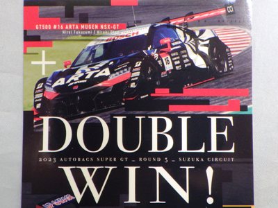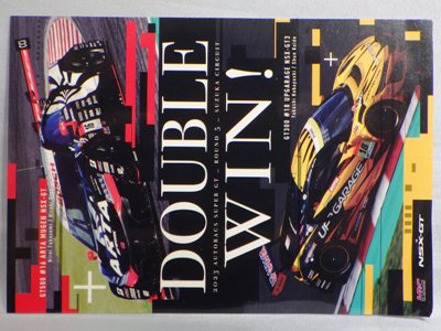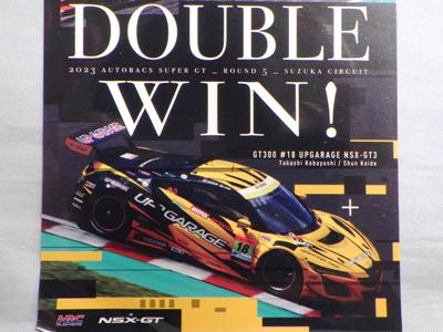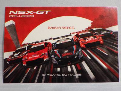 2023年12月ヤフオクにて入手。 おそらくサーキットやディーラー、青山のショールームなどで配布されたものと思われる。 スーパーGT2023シーズンの第5戦でGT500とGT300の両クラスでNSX-GTが優勝を果たしたことを記念して製作された。 サイズは12.0×8.4cm。 |