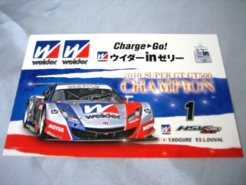 | 2011年9月コレクター仲間より譲っていただく。ウイダーのPRと共に2010年ウィダーHSVのチャンピオン獲得を アピール。10.0p×15.2p。 | |