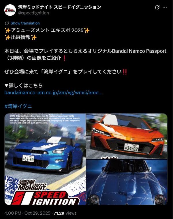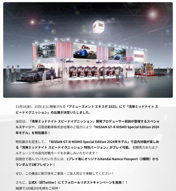 2012年まで開催されていた「アミューズメントマシンショー」と「AOUアミューズメント・エキスポ」が統合され、2013年に誕生したのが「ジャパンアミューズメントエキスポ」。アーケードゲーム、メダルゲーム、プライズゲーム向け景品、関連商品(ゲームセンター向けの両替機など)が展示される幕張メッセを会場としたイベントで、2021年、2022年はコロナウイルス感染拡大の影響により中止されたが、2023年は東京ビッグサイトに会場を移して「アミューズメントエキスポ」として復活。 2025年も11月14日(金)と15日(土)の2日間、東京ビッグサイト東5・6ホールで開催されたのだが、バンダイナムコは「湾岸ミッドナイト スピードイグニッション」を出展。 当日は、「湾岸ミッドナイト スピードイグニッション」開発プロデューサーが登壇するスペシャルステージや、日産の協力による「NISSAN GT-R NISMO Special Edition 2024年モデル」を特別展示。その展示を記念し「NISSAN GT-R NISMO Special Edition 2024年モデル」で店内対戦が楽しめる「湾岸ミッドナイト スピードイグニッション特別バージョン」がプレイ可能であった。 ここからが本題で、試遊台でプレイした参加者には、1プレイ毎にオリジナルのバンダイナムコパスポート3種の中からランダムで1枚がプレゼントされ、そのうちの1種がNSX(NC1タイプS)だった。 11月15日にメルカリに出品されたこのパスポートをさっそく入手した。 |