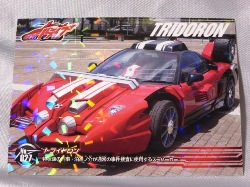 | 2014年11月27日発売。108円でカード2枚入。全30種のカードの中に何枚トライドロン関係 のカードがあるのかは不明なのだがNo.27のみ入手。「特状課の刑事・泊進ノ介が通常の事件捜査に使用するスーパーカー」と記載されている。 | |||