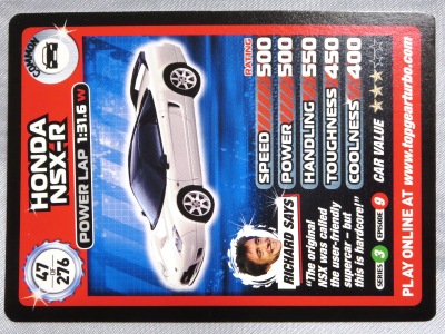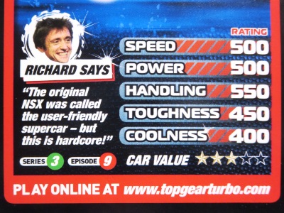 2020年2月23日にヤフオクに初登場した「TOP GEAR turbo challenge」を入手。 当サイトのトレーディングカードコーナーで4年半ぶりの新グッズで、神奈川の出品者の方が、ドイツでコレクターから直接購入した国内未発売の商品。 「TOP GEAR」は1997年から現在までイギリスBBCで放映されている自動車番組。日本でも放映されていて、NC1のNSXが初登場した回は見た記憶がある。 「turbo challenge」はBBCマガジンズが隔週で発行している子ども向けのパートワーク誌(各号の価格は2.5ポンド=2020年3月8日のレートで約340円)で、このカードが付録として付属していたが第52弾で終了している。 |