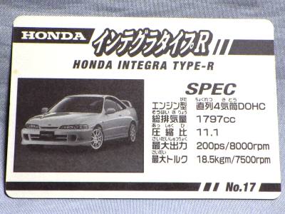 | 98年発売。全108種でNSXのNoは085。5枚入りで2〜300円で販売。金色のスペシャルカードも存在していた。 | 98年発売。企画・CG/NAVI、監修・川上完。93年型のNSX-R。裏にはリアビューの画像とスペックを掲載。 | ||