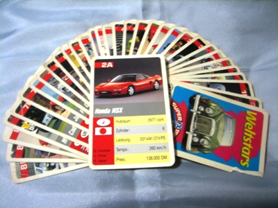 | 2013年10月オークションにて入手。出品者がドイツにてコレクターより直接購入した、世界のスポーツカーを題材にしたカードゲーム。全32枚あり、その中に日本車としてNSXが入っている。ケースなし。使用法などは不明。 | |||