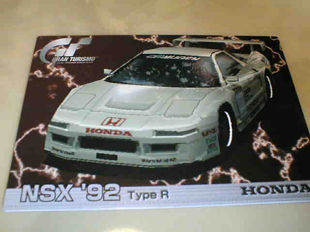 | オークションにてPSソフト「グランツーリスモ」のカードを7種まとめて購入。087はNSX'92TypeR(白)のサーキット仕様。 | 088はノーマルのNSX(赤)。 | ||