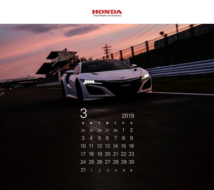 | ホンダメールニュース登録者のみの特典サービス。1作目はブルーのNew NSX。 | 毎月ホンダの商品をデザインした4種のカレンダーが提供される。2作目はリアビュー。 | ||