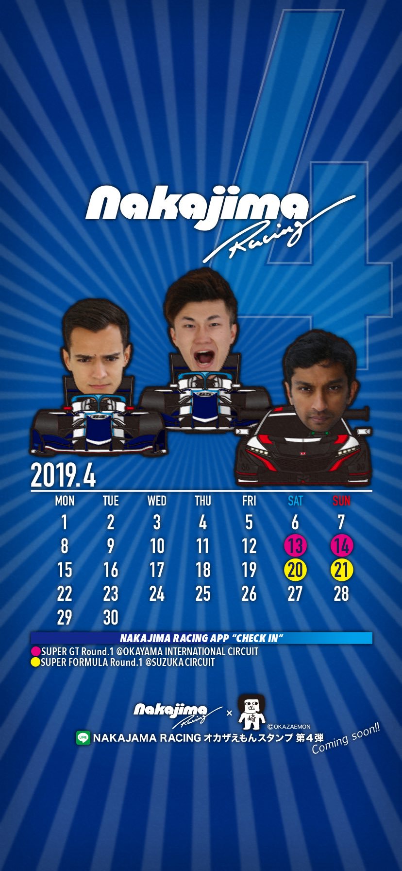2019年、ナカジマレーシングのモバイルアプリにチェックインするとポイントがもらえて、それをためると、そのポイント数に応じて 色々なナカジマレーシンググッズが抽選でもらえるサービスがスタート。 このサービスでは期間限定の画像ももらえる。期間が過ぎると、ツイッターでサンプル版しか見ることができない。 カレンダー画像は常時ツイッターからダウンロード可能。 |