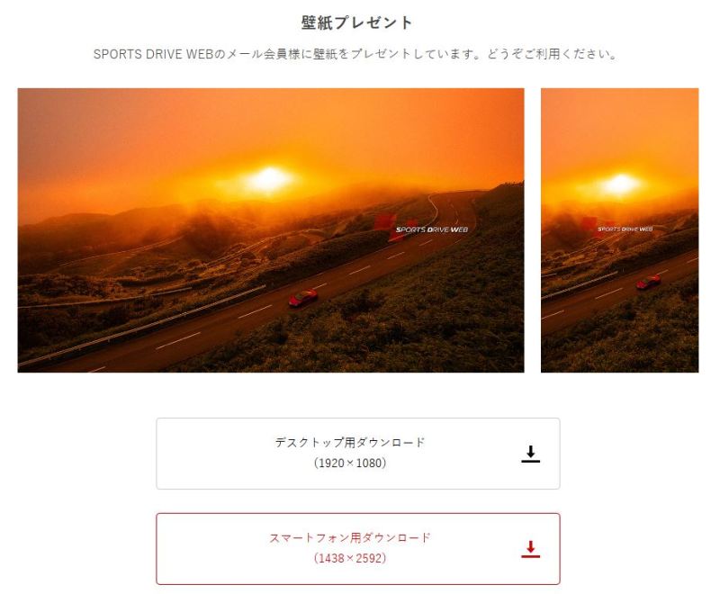 。 それをを記念し、メルマガ会員限定で、新生SPORTS DRIVE WEBロゴ入りオリジナル壁紙2種が頂けた。 (下の画像はすべて未圧縮) |