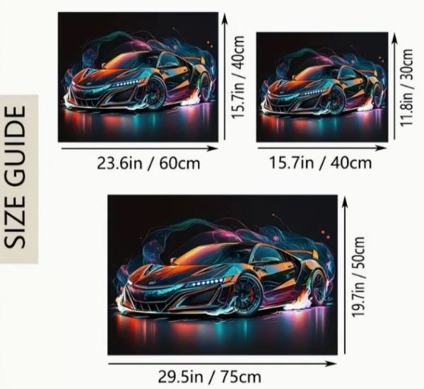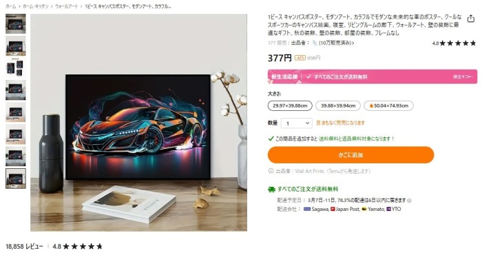 2024年2月23日に注文し、2月28日に届く。 Temuの公式サイト上の正式な商品名は「1ピースキャンバスポスター、モダンアート、カラフルでモダンな未来的な車のポスター、クールなスポーツカーのキャンバス絵画、寝室、リビングルームの廊下、ウォールアート、壁の装飾に最適なギフト、秋の装飾、壁の装飾、部屋の装飾、フレームなし」という長いもの。 29.97×39.88cmの最小サイズが377円(定価658円)。 39.88×59.94cmの中間サイズが519円(定価882円)。 50.04×74.93cmの最大サイズが727円(定価1,255円)。 いずれも定価の41〜42%OFFとなっていた(送料別)。 実際にはタイムセール中に購入したため、小さい方から339円、459円、649円という特売価格での購入だった。 |