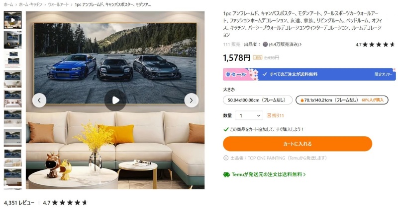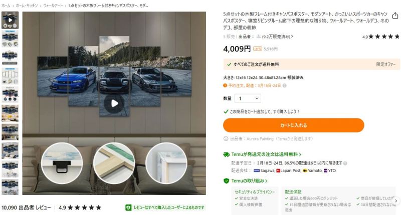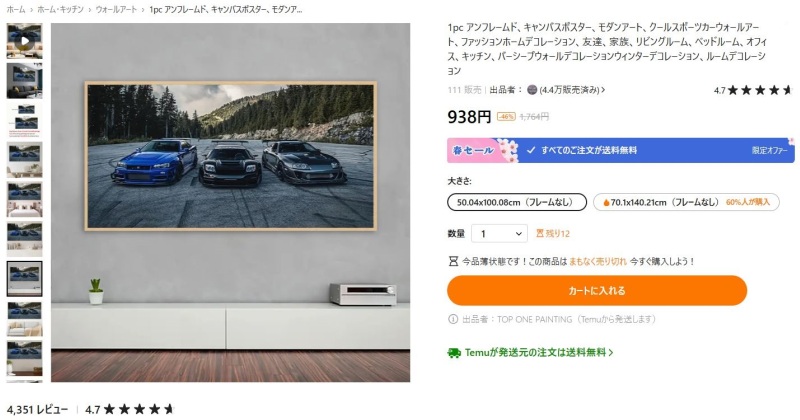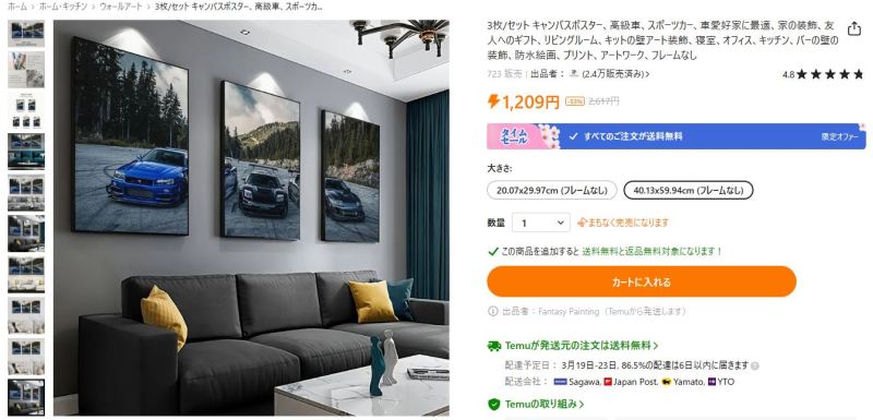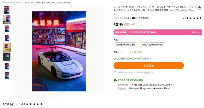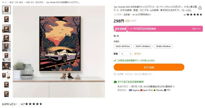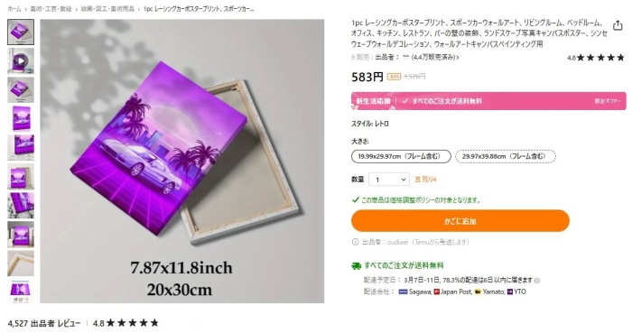 2024年2月23日に注文し、2月28日に届く。 Temuの公式サイト上の正式な商品名は、「1pc レーシングカーポスタープリント、スポーツカーウォールアート、リビングルーム、ベッドルーム、オフィス、キッチン、レストラン、バーの壁の装飾、ランドスケープ写真キャンバスポスター、シンセウェーブウォールデコレーション、ウォールアートキャンバスペインティング用」となっている。 サイズは2種類。小さい方が19.99×29.97cmで定価1,567円→62%OFFの596円、大きい方が29.97×39.88cmで定価2,353円→62%OFFの833円となっている。 購入時も3月6日現在も、大きい方は品切れで、購入したのは小さい方のみ。タイムセールを外したらしく、購入時は647円だった(掲載数日前にスクショした下の画像を確認すると、レートの関係か583円と、もっと安くなっている)。 |