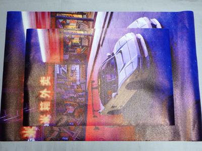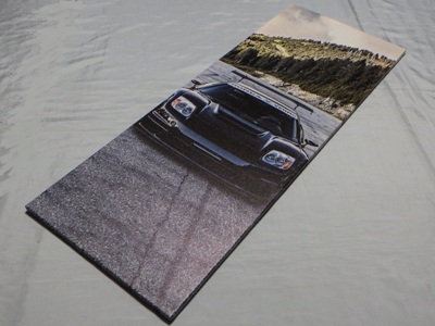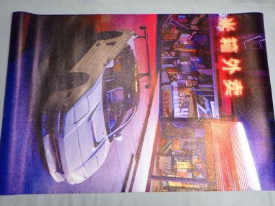 | 2010年2月ヤフオクにて入手。サイズは76×106cmと大きく、厚みも3mmとしっかりしたもの。ディーラーで後ろからライトを当てディスプレイされていたもの と思われる。左の画像も後ろから蛍光灯を当てて撮影している。ポスターに同デザインのものがある。 | |||