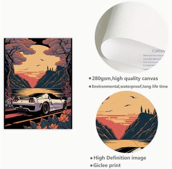 2024年2月23日に注文し、2月28日に届く。 Temuの公式サイト上の正式な商品名は、「1ピース モダンカーポスター クラシックスーパーカー、JDMスポーツカーキャンバスポスター、ウォールアートプリント、友人へのギフト、リビングルーム寝室用の壁画、ホームデコレーション、フレームなし」という相変わらずの長さ。 サイズは2種類のみ。 3月5日現在の価格は小さい方が30×45cmで定価846円→40%OFFの501円、大きい方が40×60cmで定価1,111円→39%OFFの677円となっているが、購入時はレートの関係なのか微妙に価格が異なり、前者は502円、後者は678円であった。 出品者のBoyang Artでは、上記の中華風のNA1のキャンバスポスターも他の車種と3点セットで扱っているようだが、RX-7やGT-Rをはじめとした国産スポーツカー関係のアート商品が特に充実している印象。 |