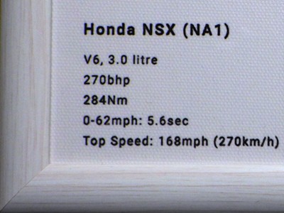 | 2010年6月14日にヤフオクに初登場し即購入。愛知県のKATO氏によるハンドメイドの額装済み商品。モデルをベースグレードとタイプRから選択し、更にボディカラーを9色から選択(オリジナルカラーもオーダー可)。ナンバープレートも指定可能で自分も愛車仕様で作成していただいた。額縁サイズは25×20×5cm、Vカットマット2段、ガラス、吊りひも付。 | |