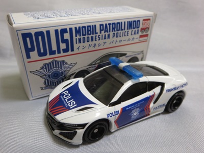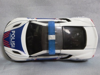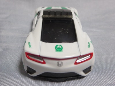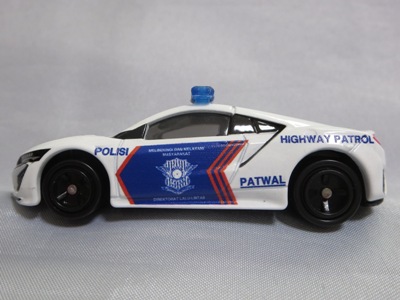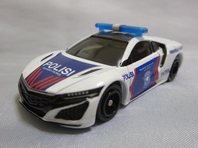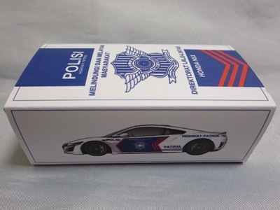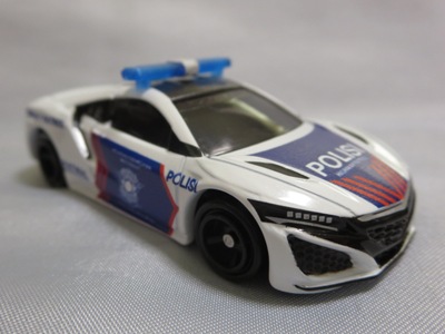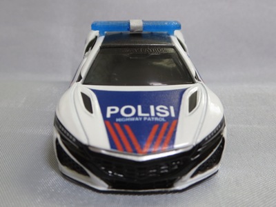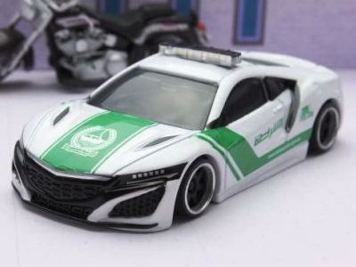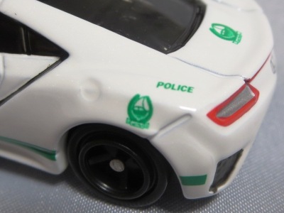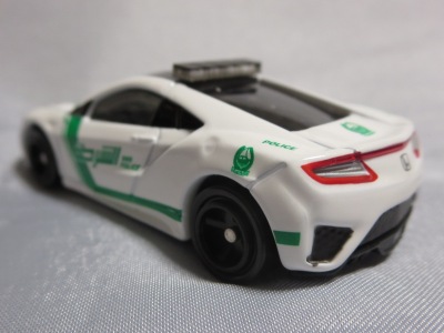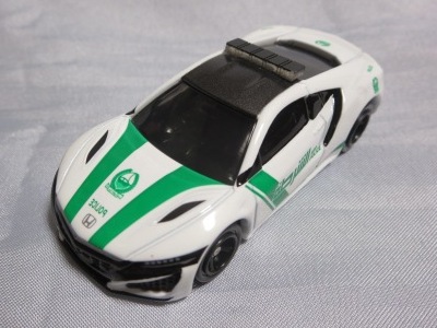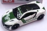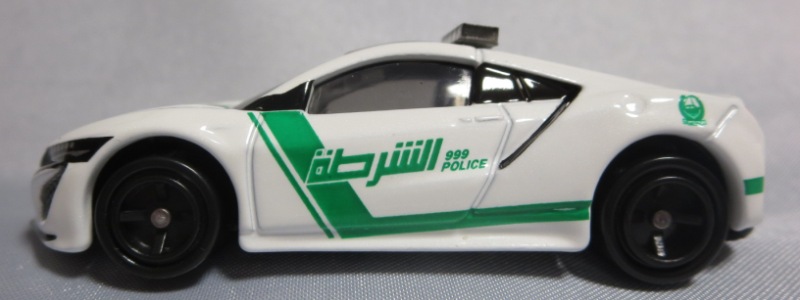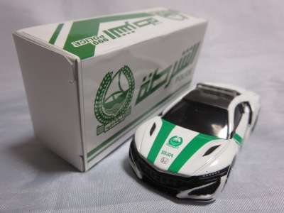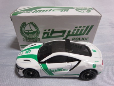 【参考画像@】トミカ43NSXの発売翌日の2016年12月17日にヤフオクに登場した2次加工トミカ第1号。今回の入手品とはボンネットのデザインが異なるが、実在する数々のスーパーカーベースのドバイパトカーの多く(マクラーレンP4/1、ブガッティヴェイロン、フェラーリFF、ランボルギーニ・アヴェンタドール、日産GT-Rなど)が、このデザインを採用している。このモデルにはルーフ上のパトライトがない。 |