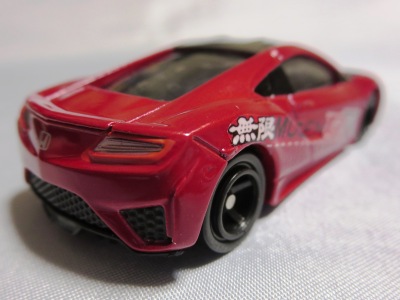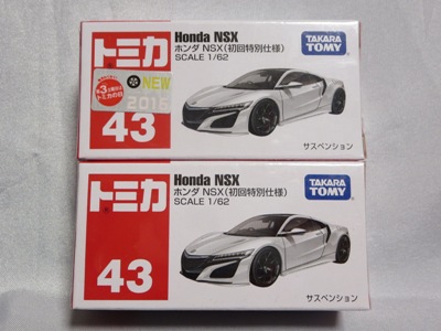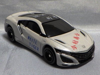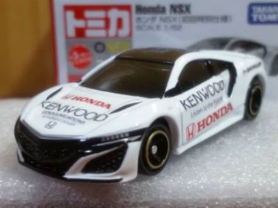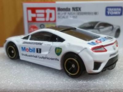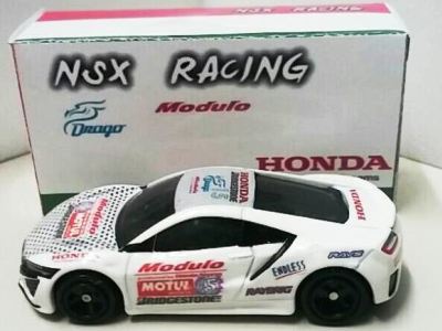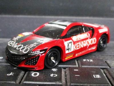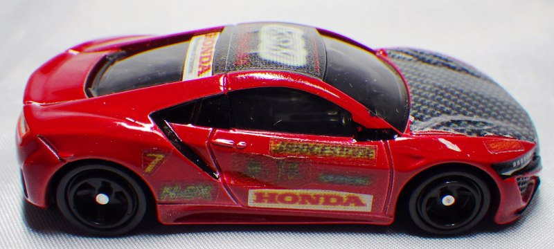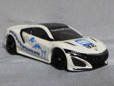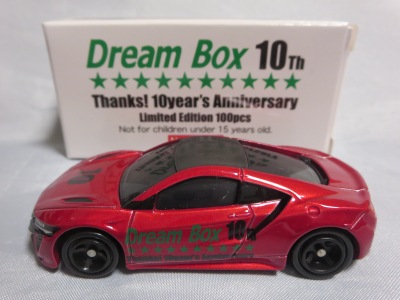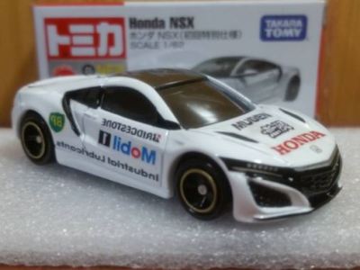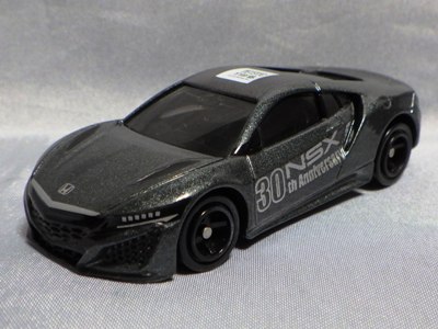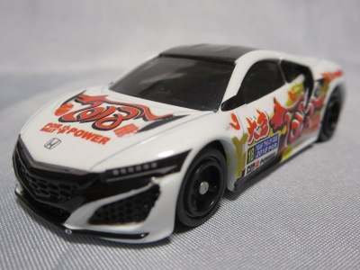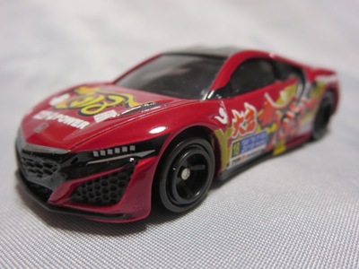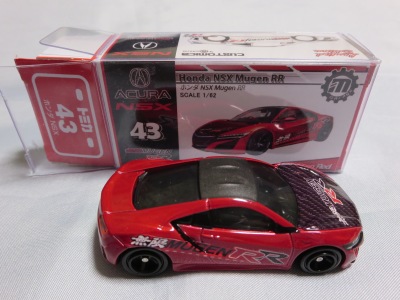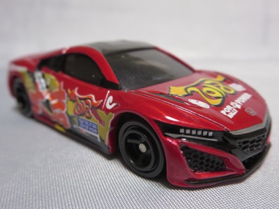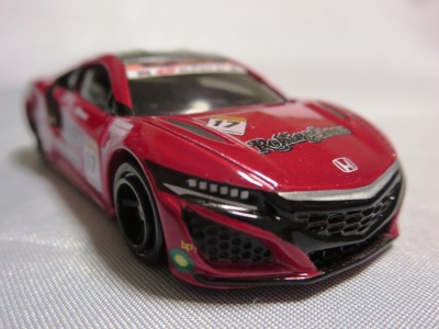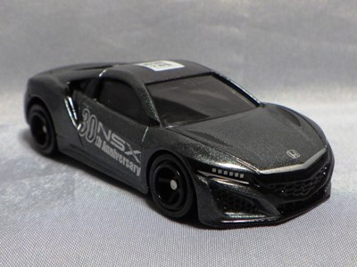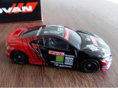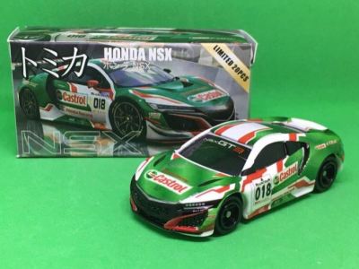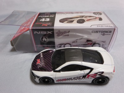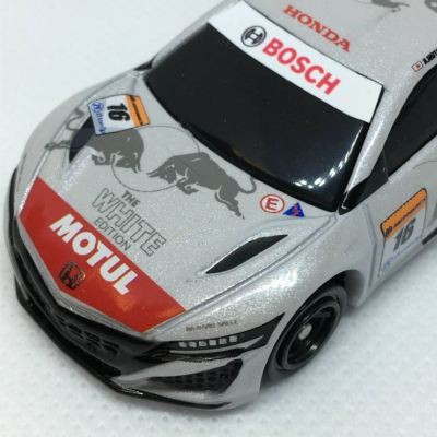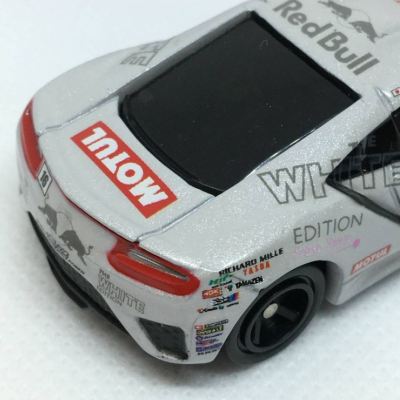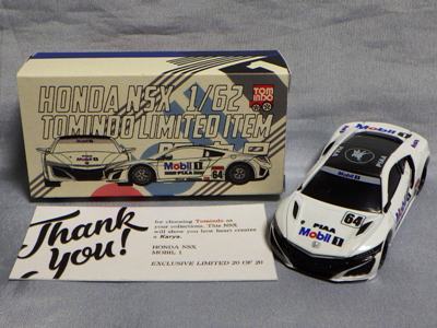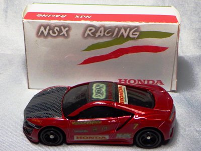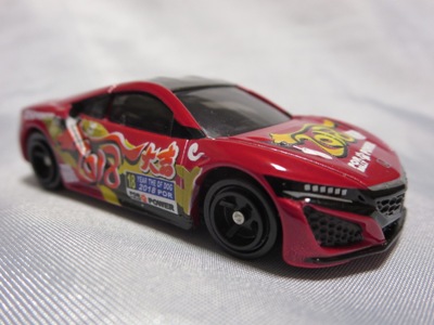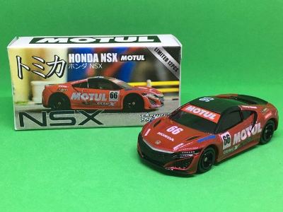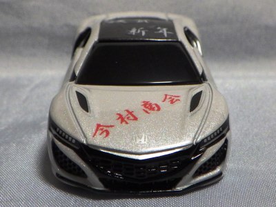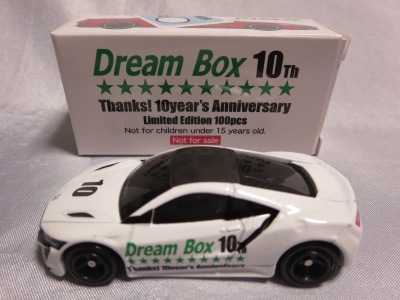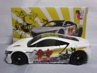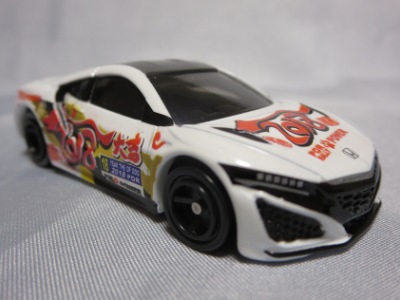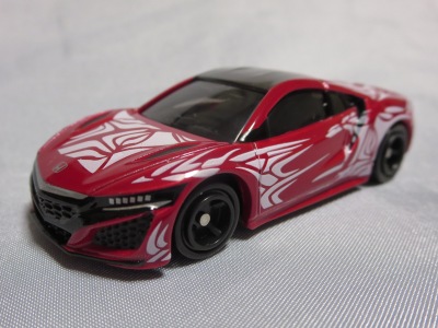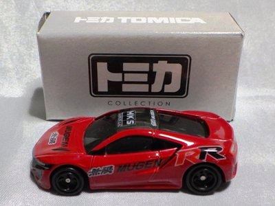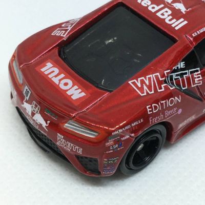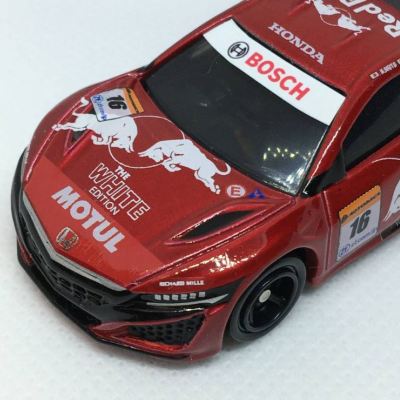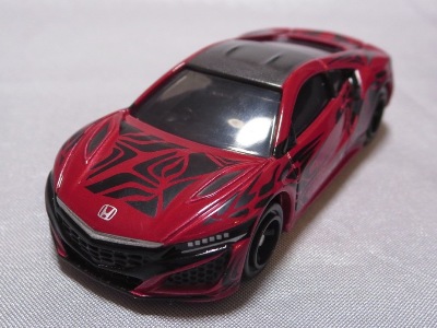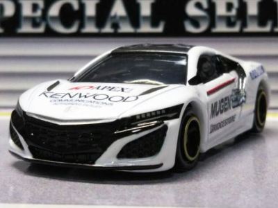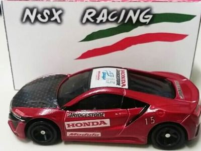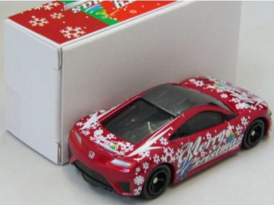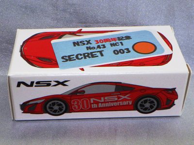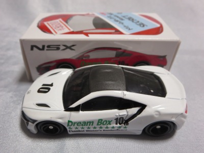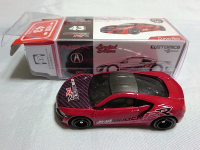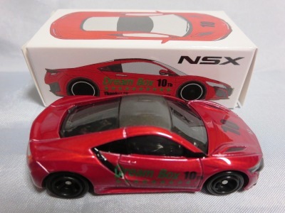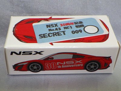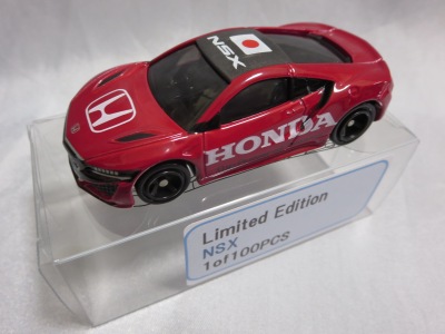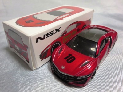| 2017年1月13日発売。新型NSXトミカとして初の2次加工モデル。初回特別カラー版と通常カラー版の両方あり。ルーフにホンダマーク、両ドアにNSXロゴとチェッカーフラッグデザインのタンポが入る。 付属のクリアケースには、両ドアと同様のデザインがプリントされている。 購入先はドリームボックスであるが、複数あるらしい製作元の個人名や会社名は表に出すと差し障りがあるということで、あえて「〜特注」という名称を付けないでおく。 1月18日にオークションに初登場し、翌日の落札額は、限定カラーが15,500円、通常カラーが10,500円と驚きの高騰ぶり。その後も高額落札が暫く続いた。 |