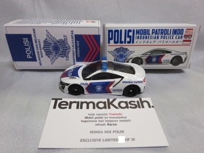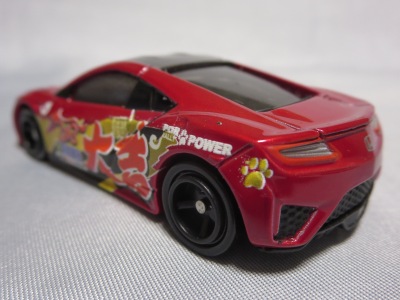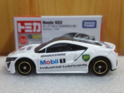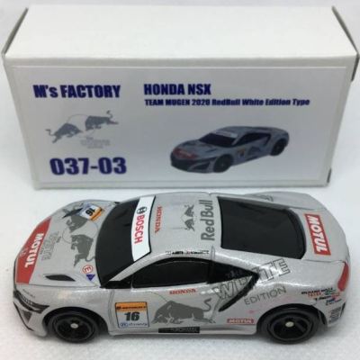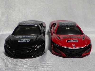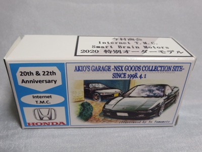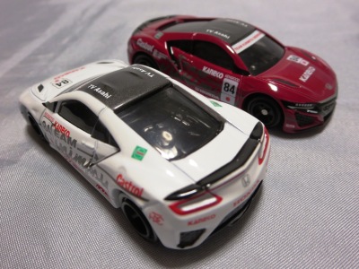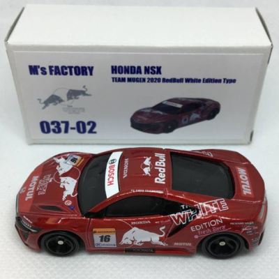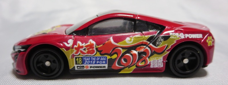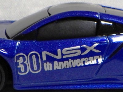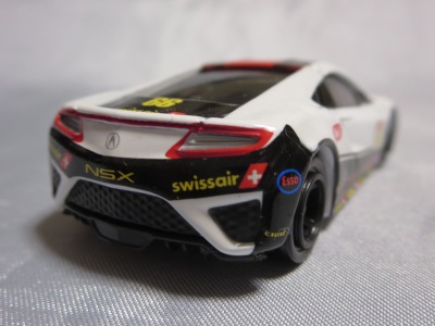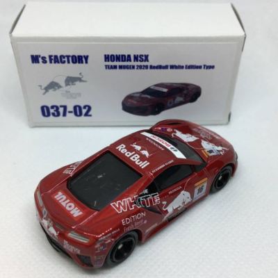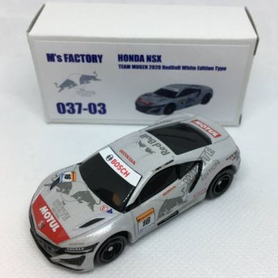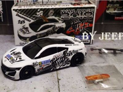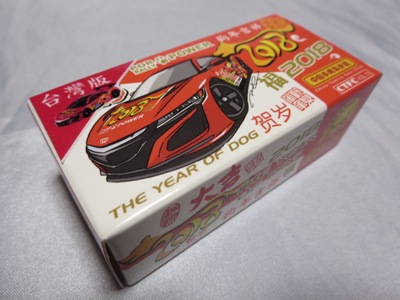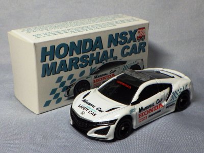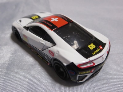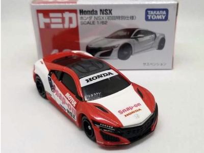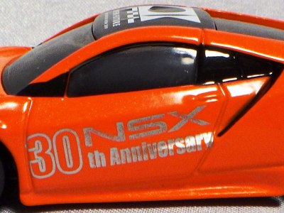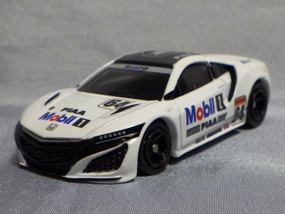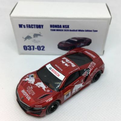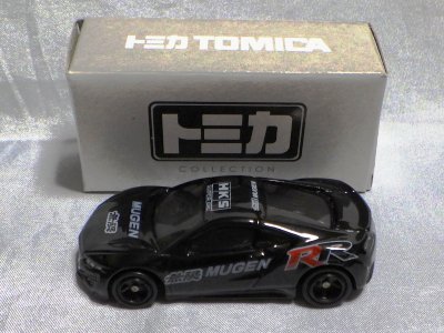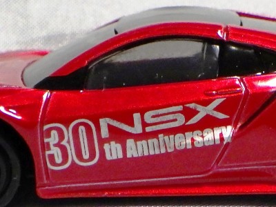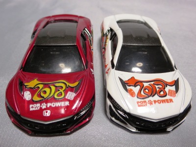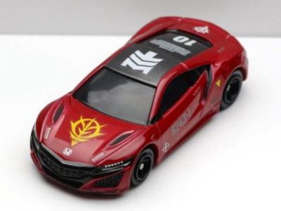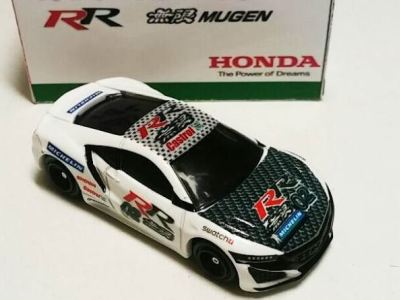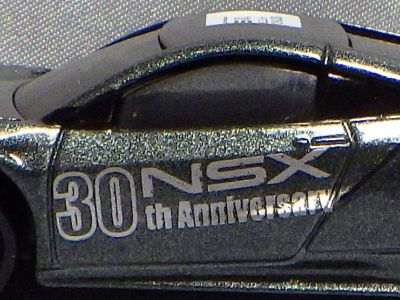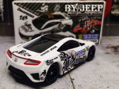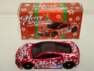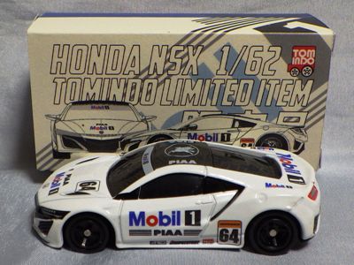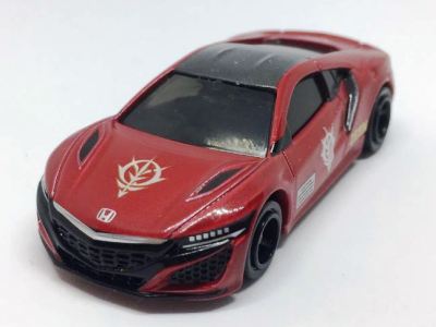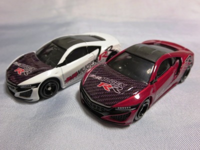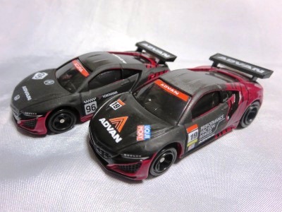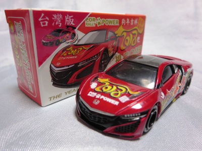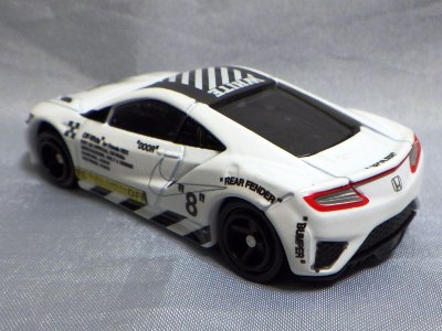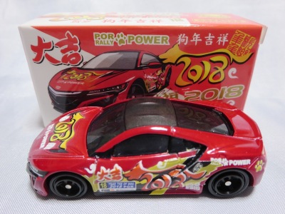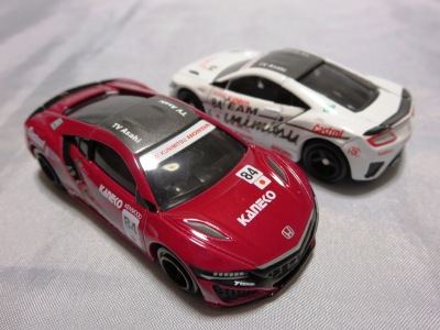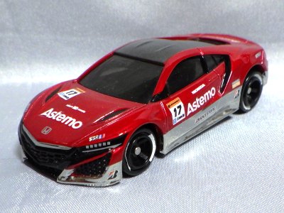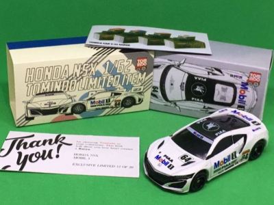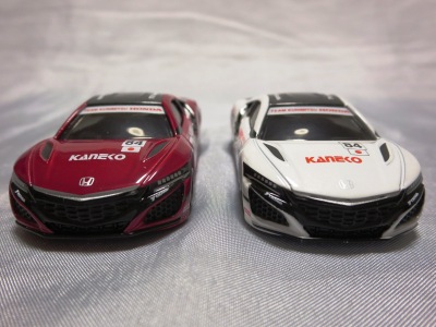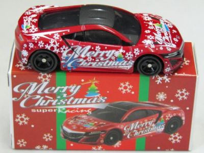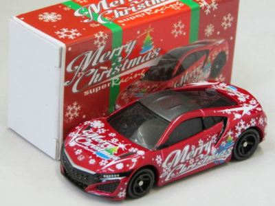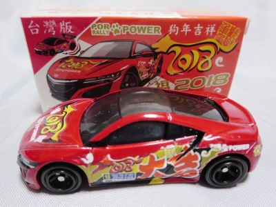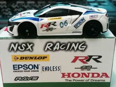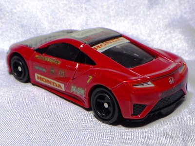 | 2017年1月13日発売。新型NSXトミカとして初の2次加工モデル。初回特別カラー版と通常カラー版の両方あり。ルーフにホンダマーク、両ドアにNSXロゴとチェッカーフラッグデザインのタンポが入る。 付属のクリアケースには、両ドアと同様のデザインがプリントされている。 購入先はドリームボックスであるが、複数あるらしい製作元の個人名や会社名は表に出すと差し障りがあるということで、あえて「〜特注」という名称を付けないでおく。 1月18日にオークションに初登場し、翌日の落札額は、限定カラーが15,500円、通常カラーが10,500円と驚きの高騰ぶり。その後も高額落札が暫く続いた。 |