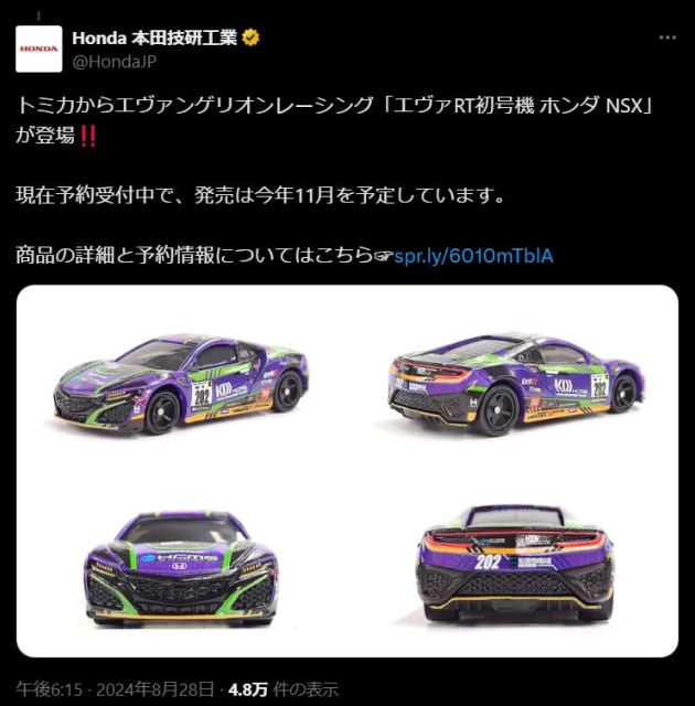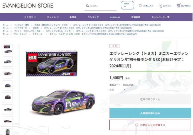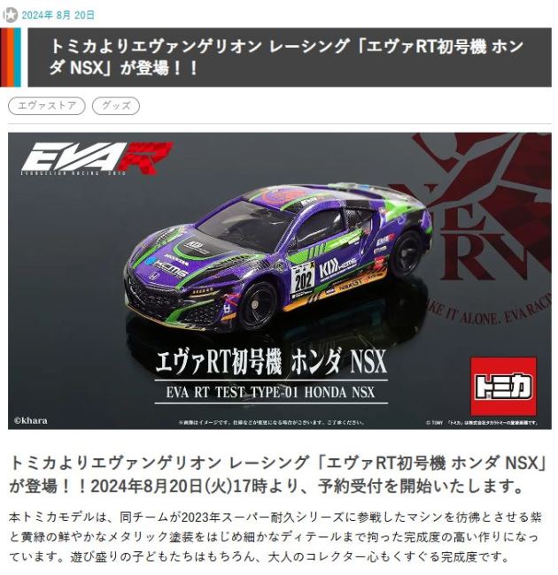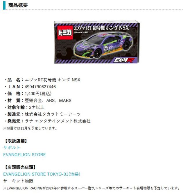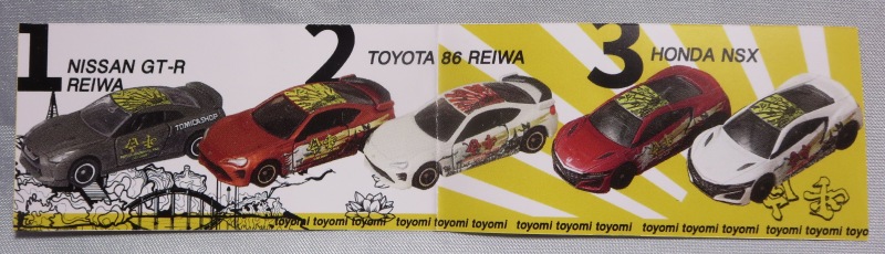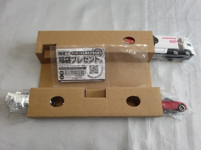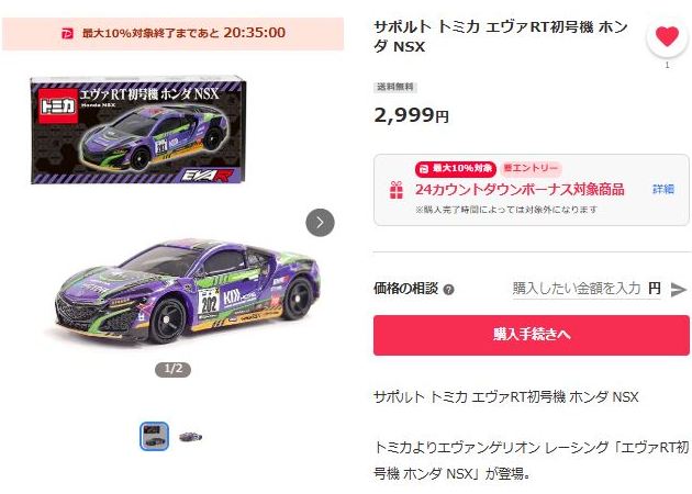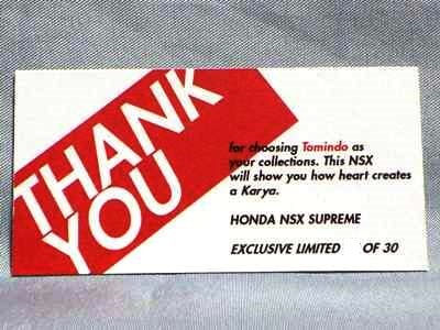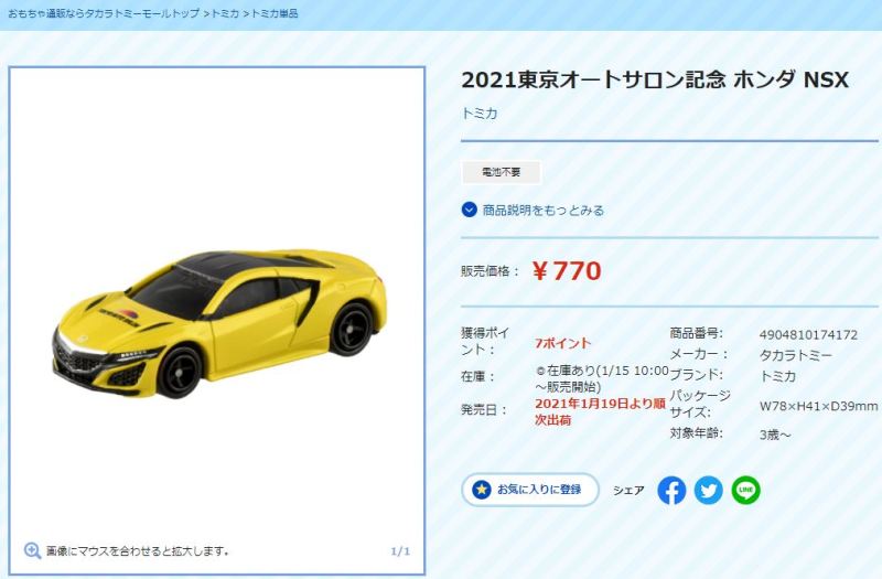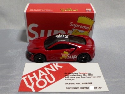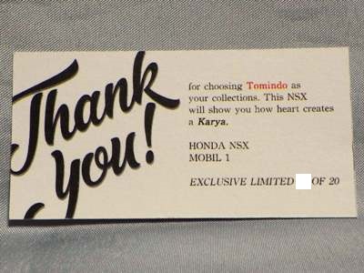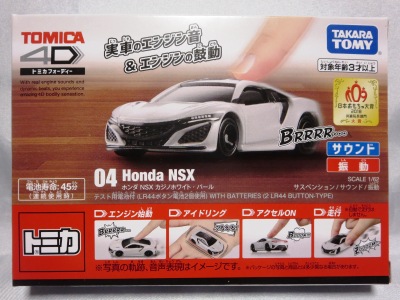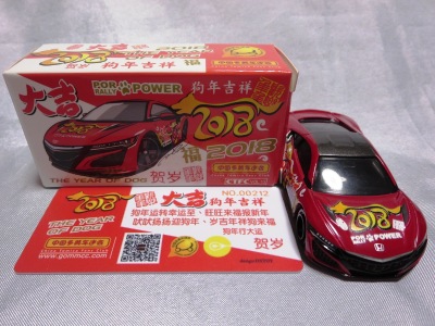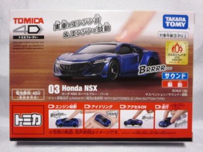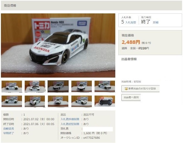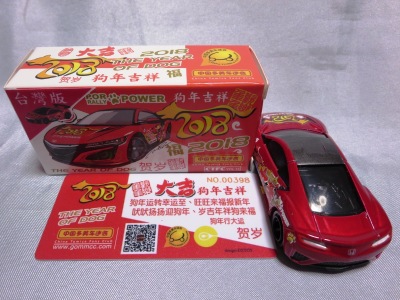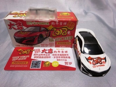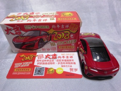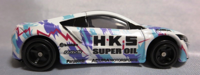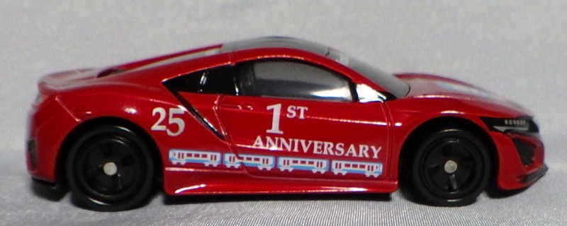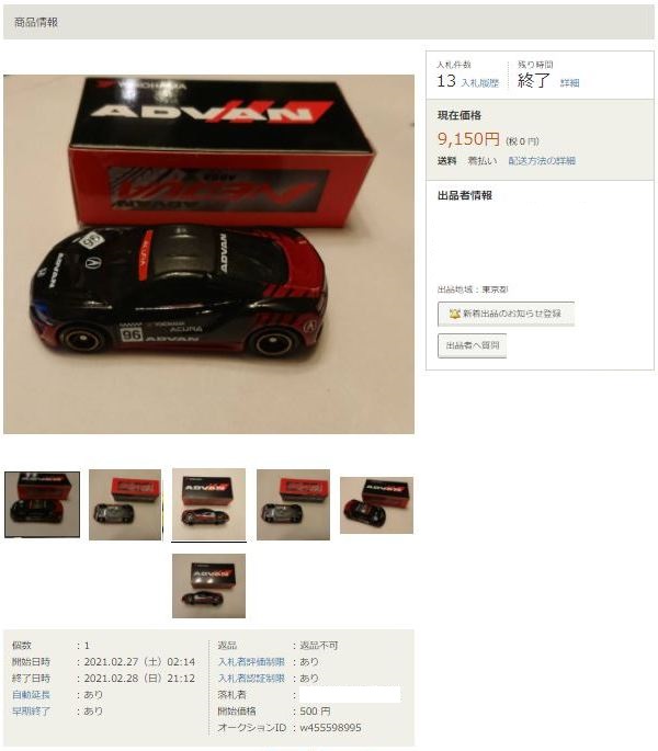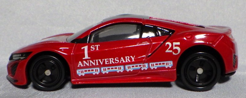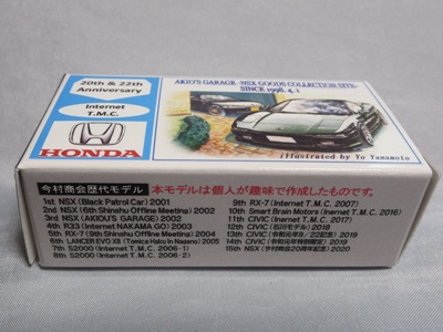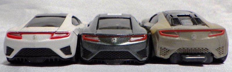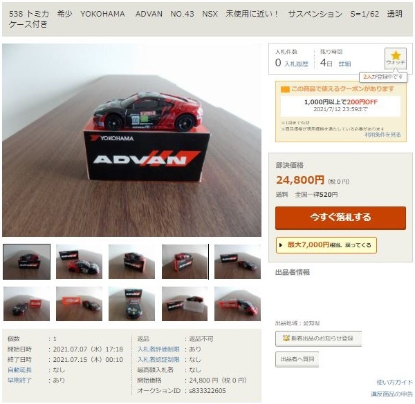 2017年6月4日ヤフオク初登場。当日、京王プラザホテル南館3階で開催された「第9回新宿おもちゃカーニバル」にて、BMWi8との2台セットで5,000円で販売されたもの。BMW i8のサイズに合わせて箱は大きめ(NSXの全長は約71mm、BMW i8の全長は約76mm)。