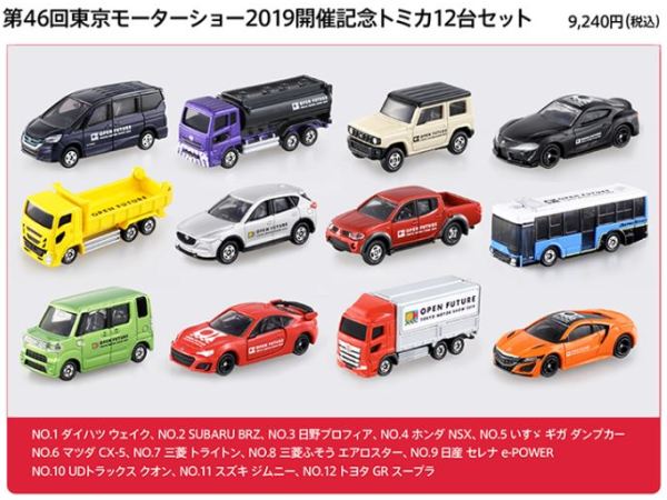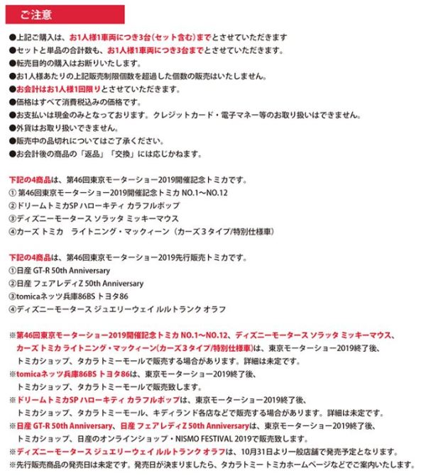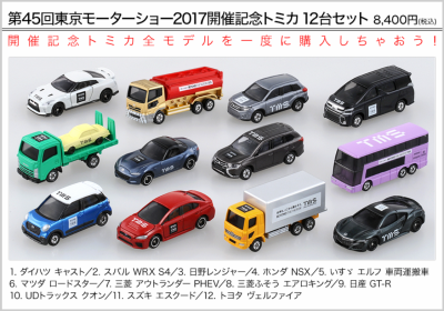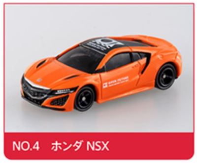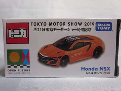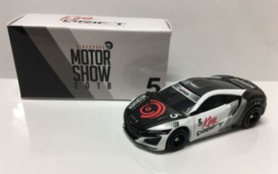 | 2017年10月25日から11月5日にかけて開催された第45回東京モーターショー2017の初日にヤフオク初登場。プレスデーであった25日と26日の両日共に記念トミカ12種を8時から販売。価格は1台700円で12種セット8,400円。 12種のうちNo.4が新型NSXで、カラーは緑がかったガンメタ。ルーフと両サイドにショーのロゴがタンポ印刷されている。箱の裏面には2017年9月20日製造を示す「I2017」の刻印が入る。 一般公開日前日の27日には購入希望者が押し寄せ、プレスデーでは5分で買えたのに、その日は150分待ちの行列ができた。 ヤフオクでは登場からしばらくは1,000円から1,500円の落札相場が続いていたが、11月13日にやっと1,000円を切った。 |