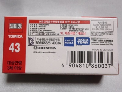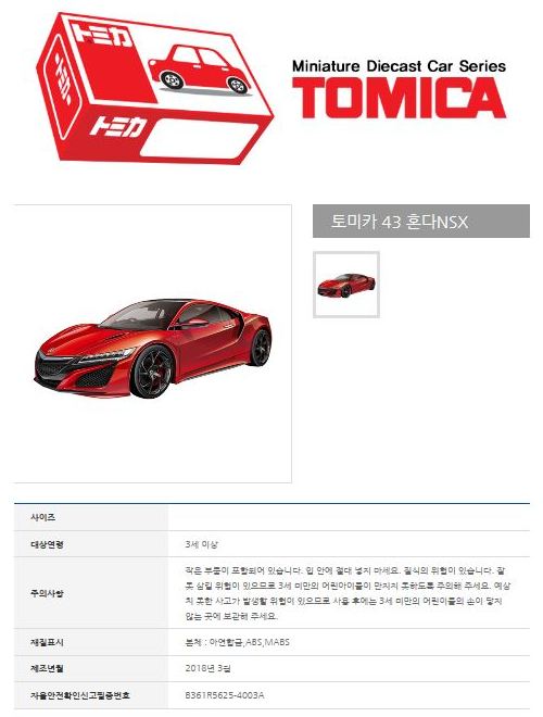 토미카 43 혼다 사이즈 대상연령 3세 이상 재질표시 본체 : 아연합금,ABS,MABS 제조년월 2018년 3월 자율안전확인신고필증번호 |