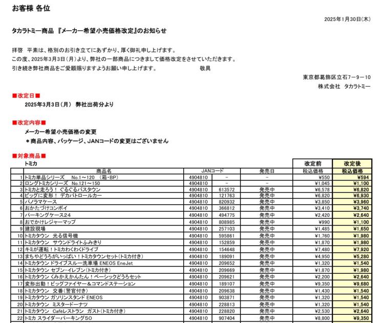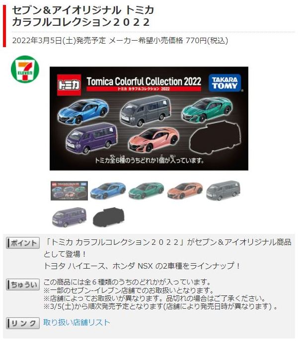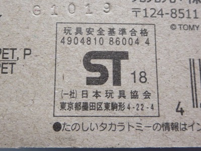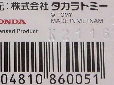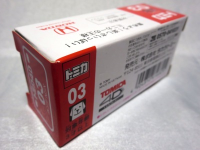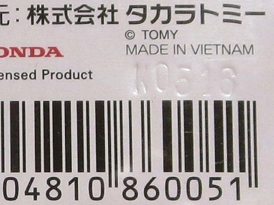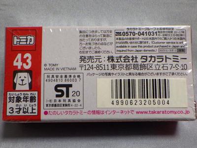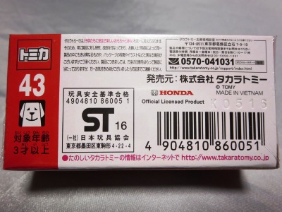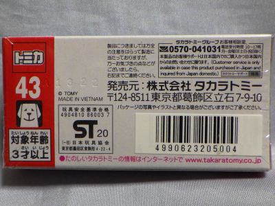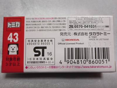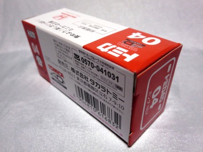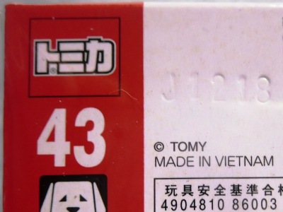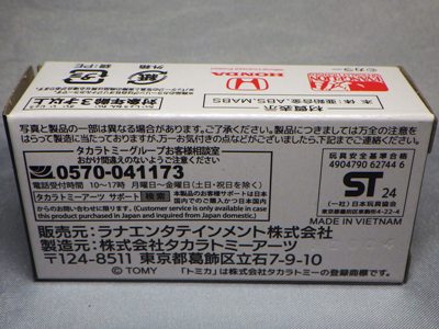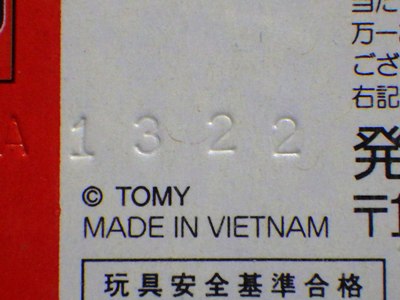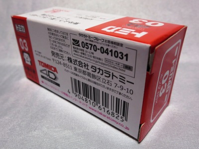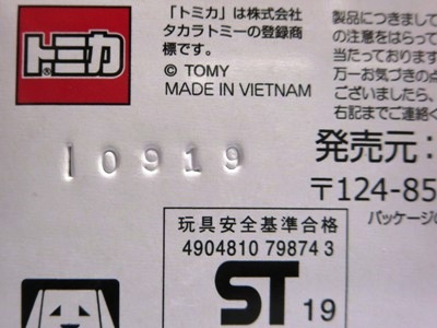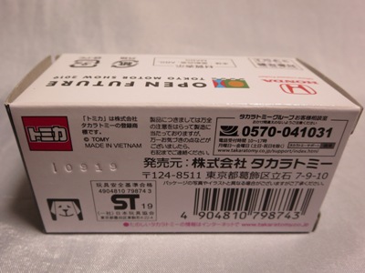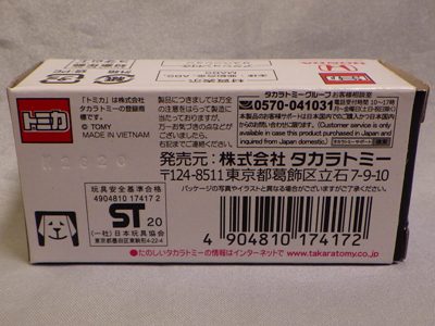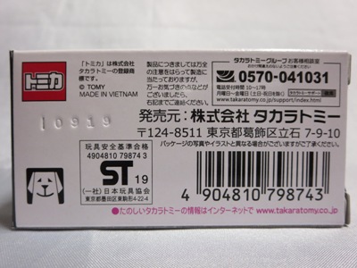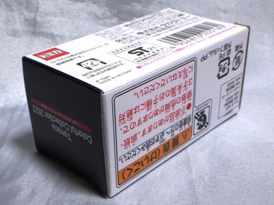 2024年11月16日に地元のトイザらスで購入。 2022年10月17日製造モデル。 裏板の刻印はJ22で、パッケージの刻印と同じ。 購入価格は449円税込だったが、トミカの通常品の定価は購入当時550円税込で、2025年3月3日以降は594円税込に値上げされている。 |